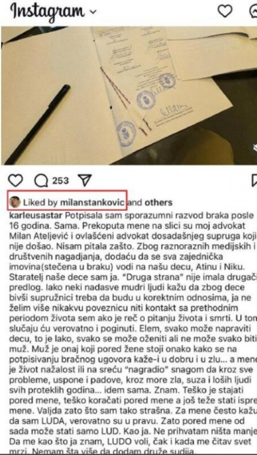 - Potpisala sam sporazumni razvod braka posle 16 godina. Sama. Prekoputa mene na slici su moj advokat Milan Ateljević i ovlašćeni advokat dosadašnjeg supruga koji nije došao. Nisam pitala zašto. Zbog raznoraznih medijskih i društvenih nagadjanja, dodaću da se sva zajednička imovina (stečena u braku) vodi na našu decu, Atinu i Niku. Staratelj naše dece sam ja. “Druga strana” nije imala drugačiji predlog. Iako neki nadasve mudri ljudi kažu da zbog dece bivši supružnici treba da budu u korektnim odnosima, ja ne želim više nikakvu poveznicu niti kontakt sa prethodnim periodom života sem ako je reč o pitanju života i smrti. U tom slučaju ću verovatno i poginuti - navela je Karleuša u svojoj objavi na Instagramu.