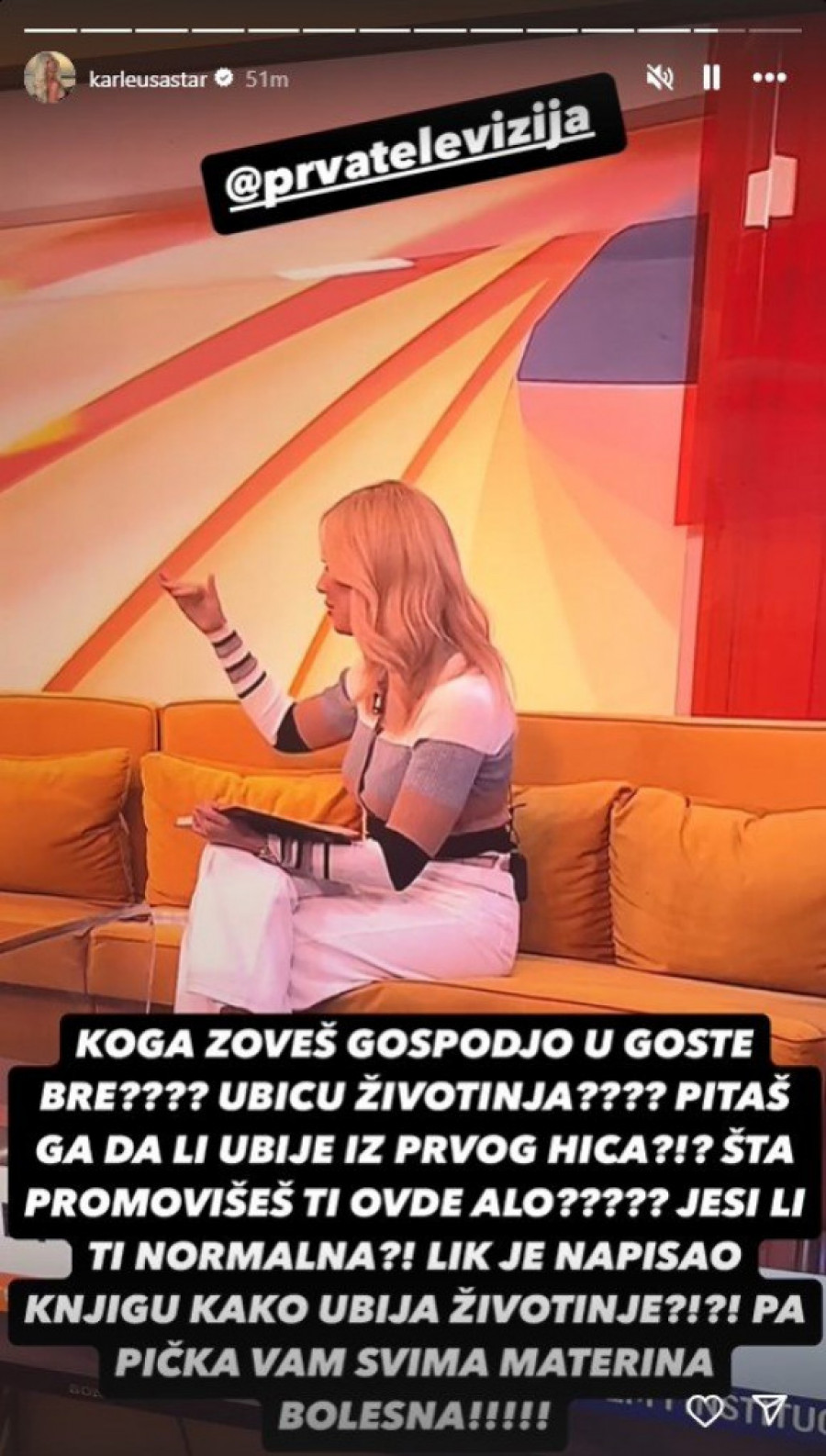 - Šta pričaš ti, gospođo?! Koga zoveš gospođo u goste bre?! Ubicu životinja? Pitaš ga da li ubije iz prvogh hica? Šta promovišeš ti ovde, alo?! Jesi li ti normalna? Lik je napisao knjigu kako ubije životinje. Pa pi*ka vam svima materina bolesna!