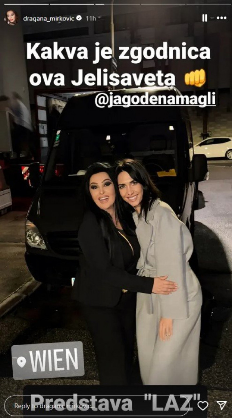 Poznata pevačica Dragana Mirković izazvala je pažnju javnosti svojom podrškom gostovanju srpskih glumaca u Beču. Na svom Instagram profilu, Dragana je podelila fotografiju sa predstave "Laž" u kojoj su učestvovali Miloš Biković, Tamara Krcunović, Jelisaveta Teodosić i Miodrag Radonjić. Osim toga, oduševljenje je izrazila i povodom fizičkog izgleda glumice Jelisavete Teodosić.