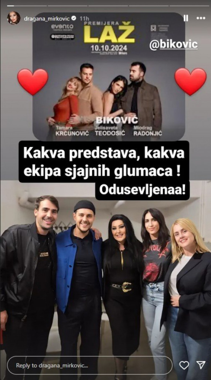 - Kakva predstava, kakva ekipa sjajnih glumac! Oduševljena - napisala je Dragana na objavi, a ni glumac Miloš Biković nije krio zahvalnost prema Dragani.