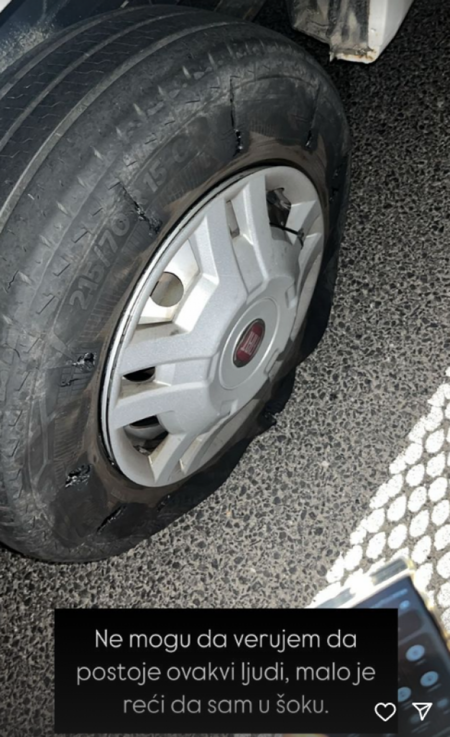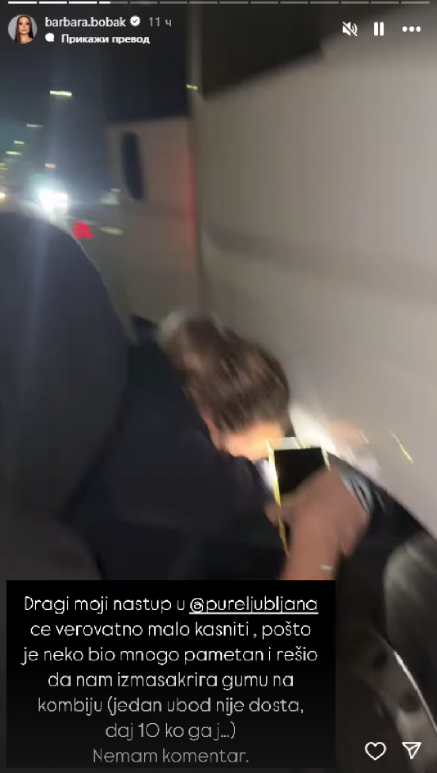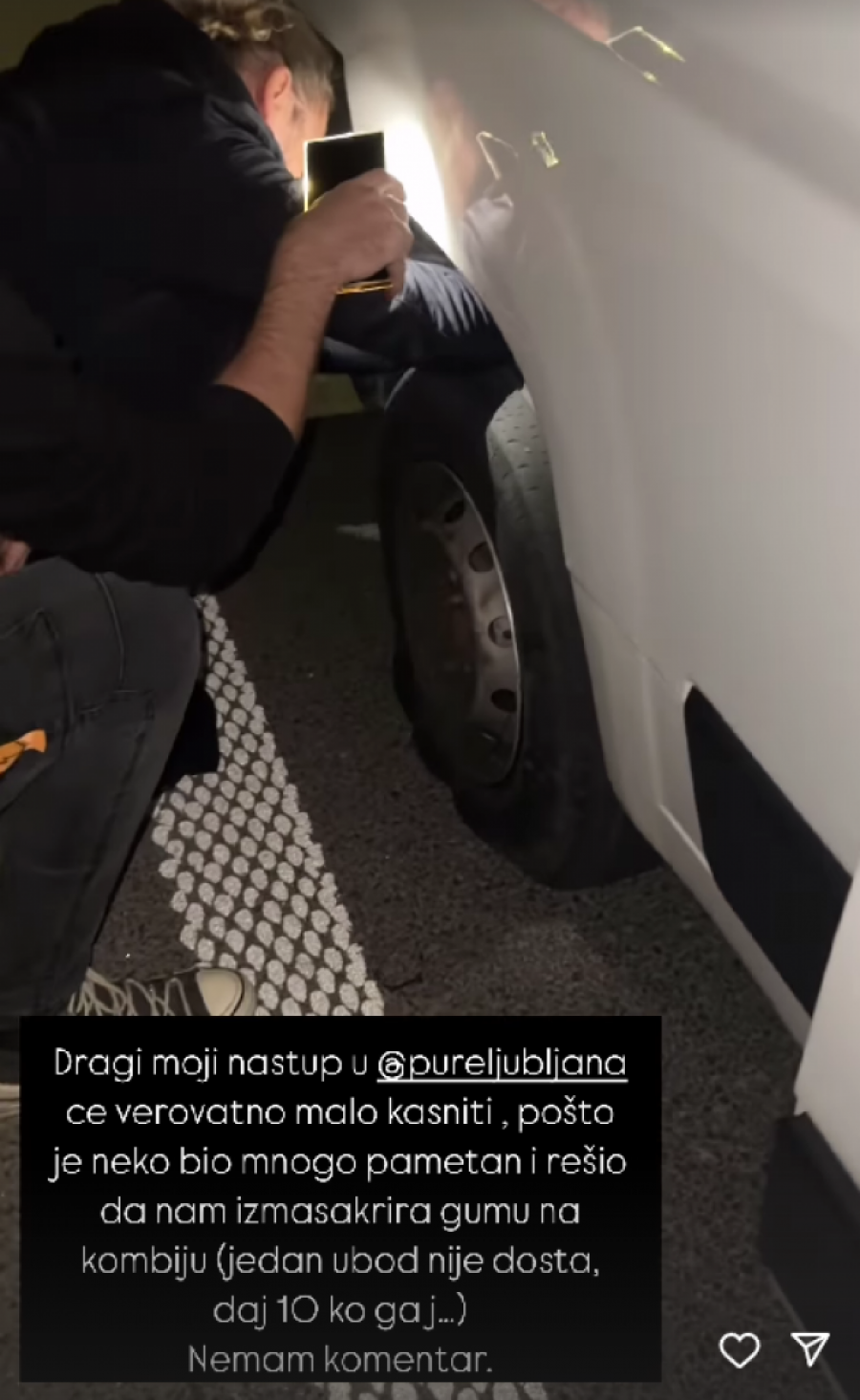 - Nastup u Ljubljani će verovatno malo kasniti, pošto je neko mnogo pametan rešio da nam izmasakrira gumu na kombiju (jedan ubod nije dosta, daj 10...) - napisala je ironično, izražavajući šok i nevericu zbog onoga što im se dogodilo.