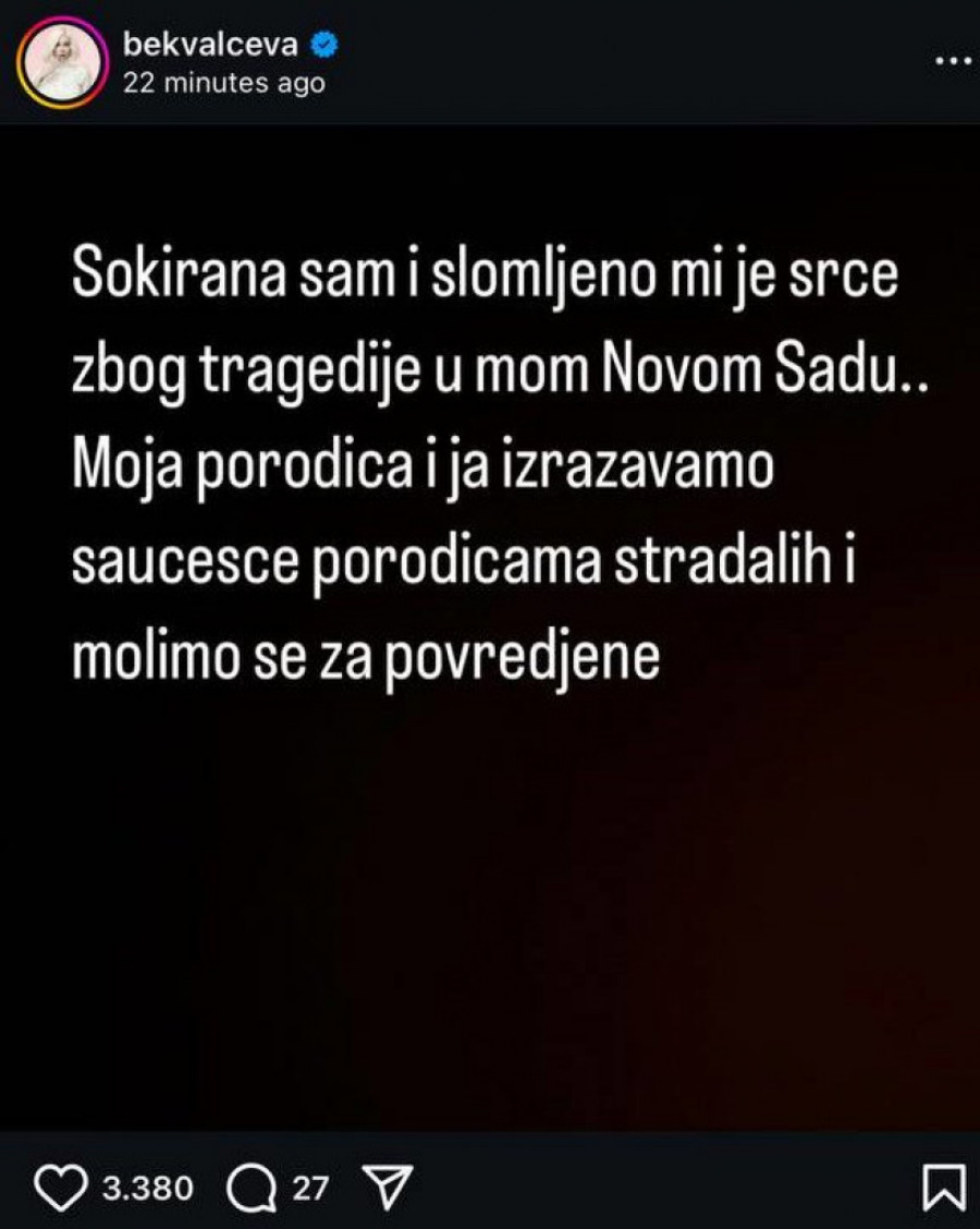 - Šokirana sam i slomljeno mi je srce zbog tragedije u Novom Sadu... moja porodica i ja izražavamo saučešće porodicama stradalih i molimo se za povređene - napisala je pevačica u objavi.