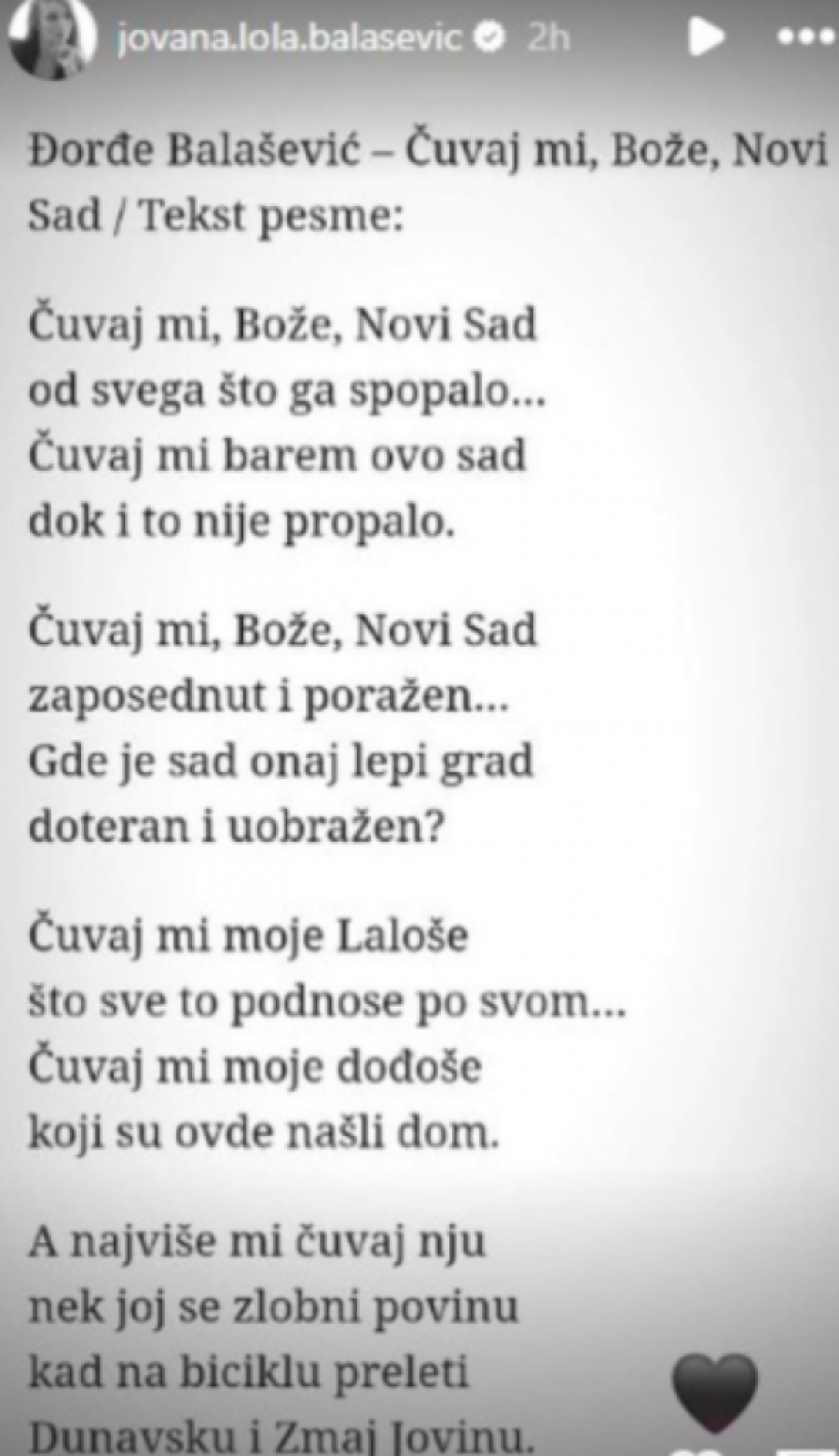 Jovana je na svom Instagram profilu podelila dirljive stihove iz očevog dela "Čuvaj mi Bože Novi Sad", simbolično izražavajući ljubav prema gradu na Dunavu.