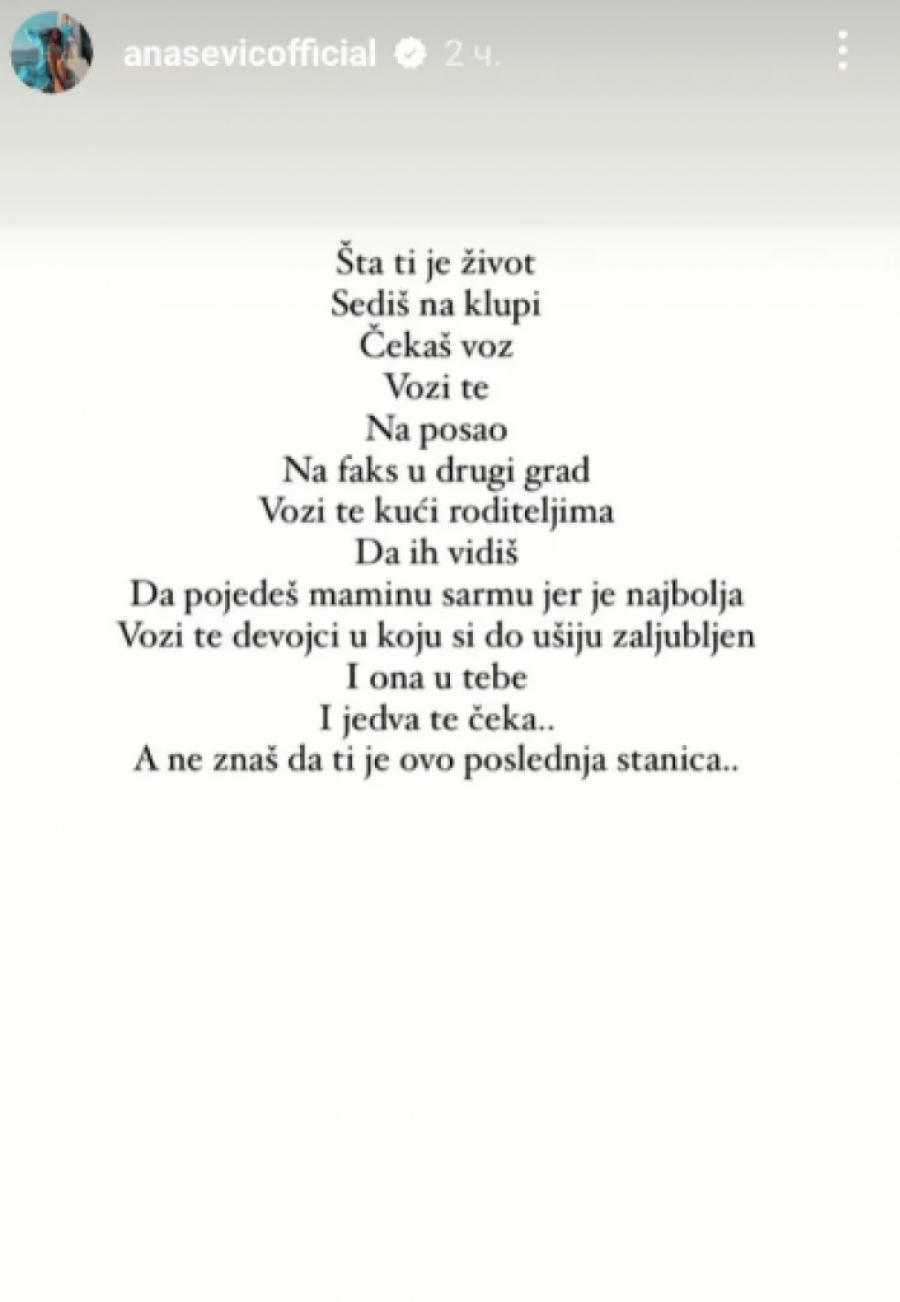- Šta ti je život, sediš na klupi, čekaš voz, vozi te na posao, na faks, u drugi grad, vozi te kući roditeljima da ih vidiš, da pojedeš maminu sarmu, jer je najbolja, vozi te devojci u koju si do ušiju zaljubljen, i ona u tebe, jedva te čeka, a ne znaš da ti je ovo poslednja stanica – objavila je Ana na svom Instagramu.