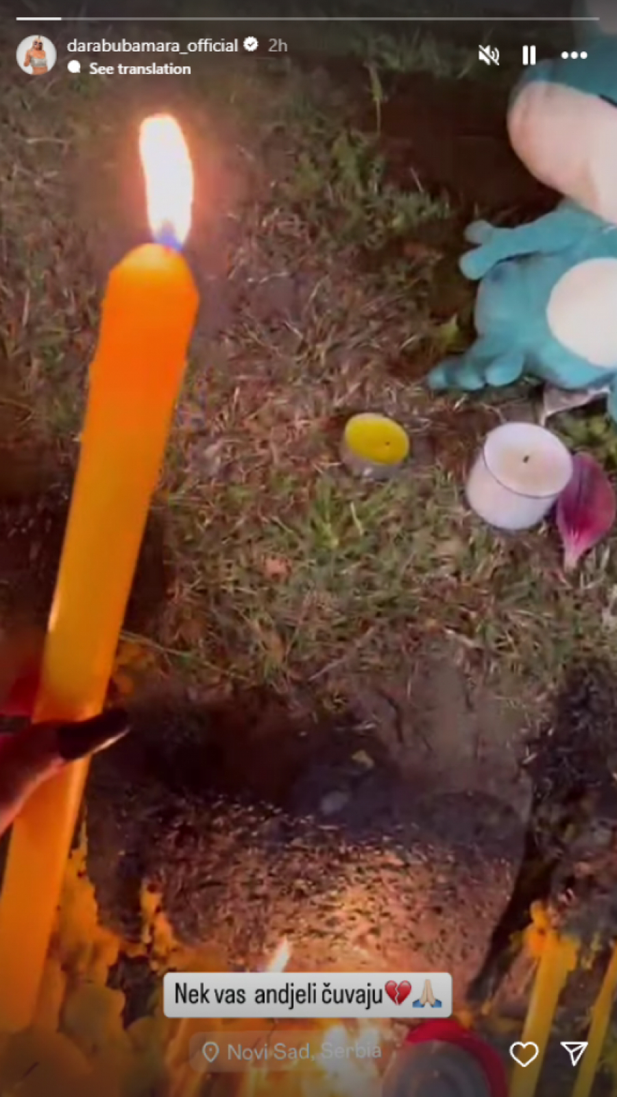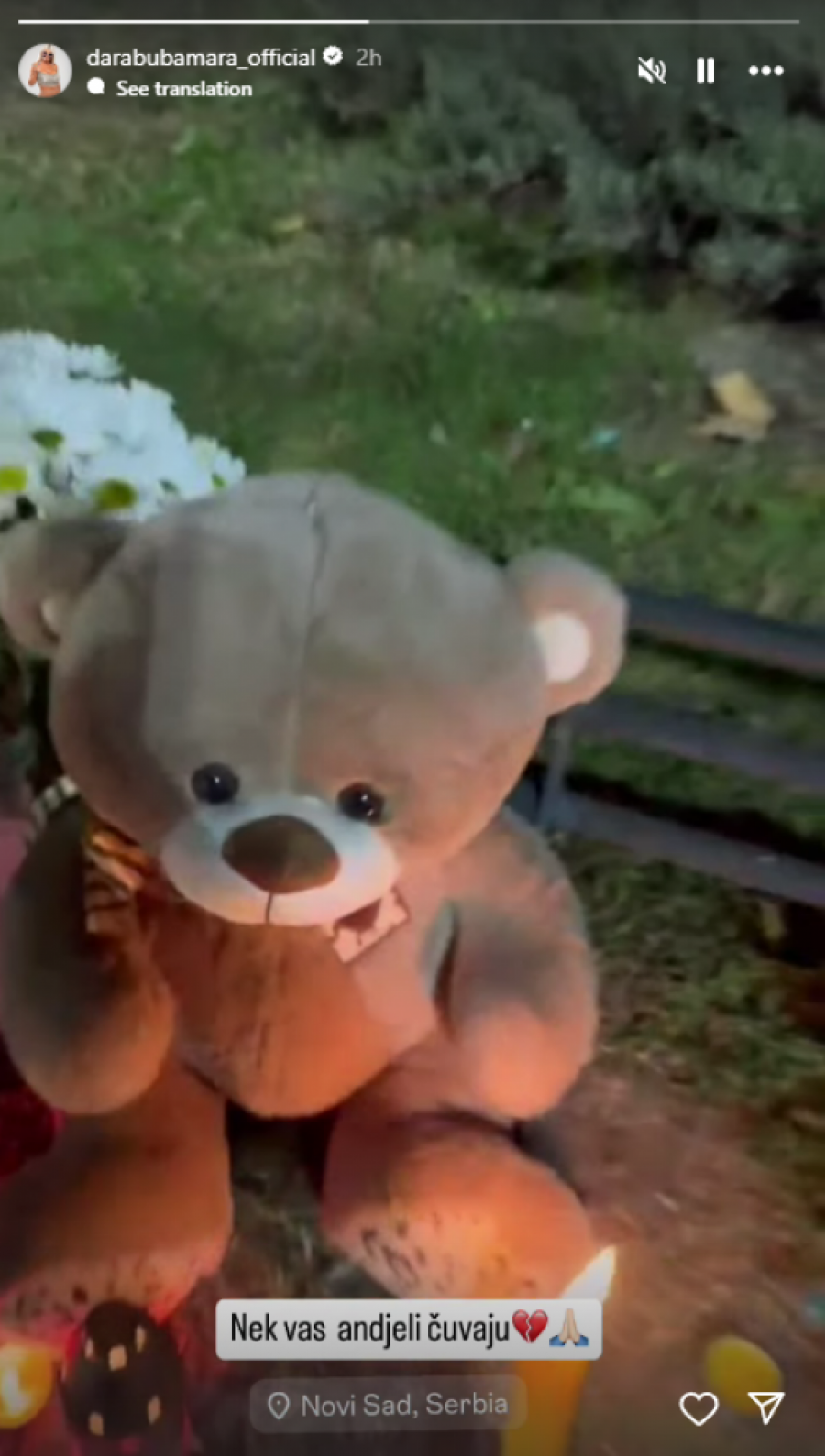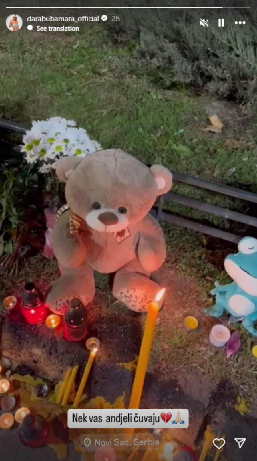 Dara, inače rođena Novosađanka, donela je velikog plišanog medveda i zapalila sveću ispred stanice, posvetivši svoj gest svim stradalima. Na svom snimku na društvenim mrežama, uz sliku medveda i sveće, pevačica je ostavila i potresnu poruku.