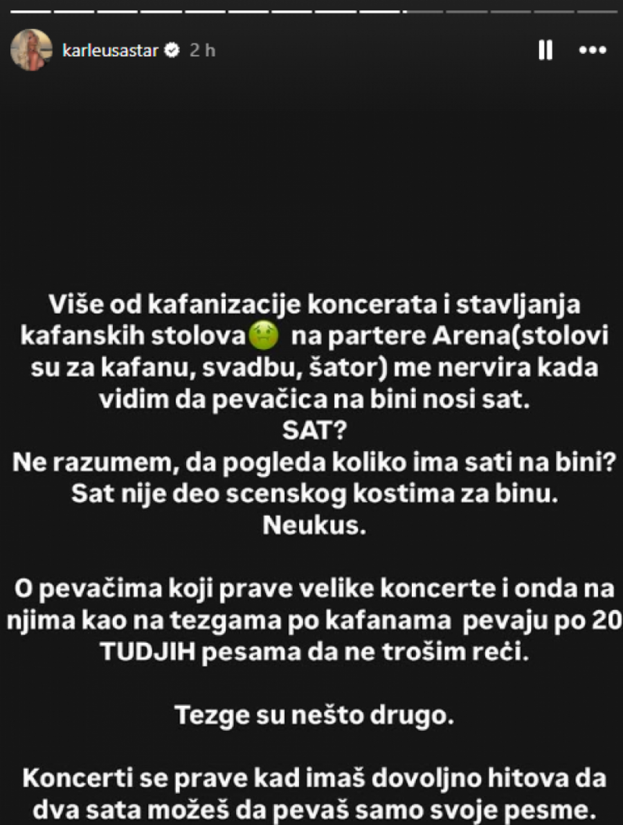 - Više od kafanizacije koncerata i stavljanja kafanskih stolova na partere Arena (stolovi su za kafanu, svadbu, šator) nervira me kada vidim da pevačica na bini nosi sat. Sat? Ne razumem, da pogleda koliko ima sati na bini? Sat nije deo scenskog kostima za binu. Neukus - napisala je ona i dodala: