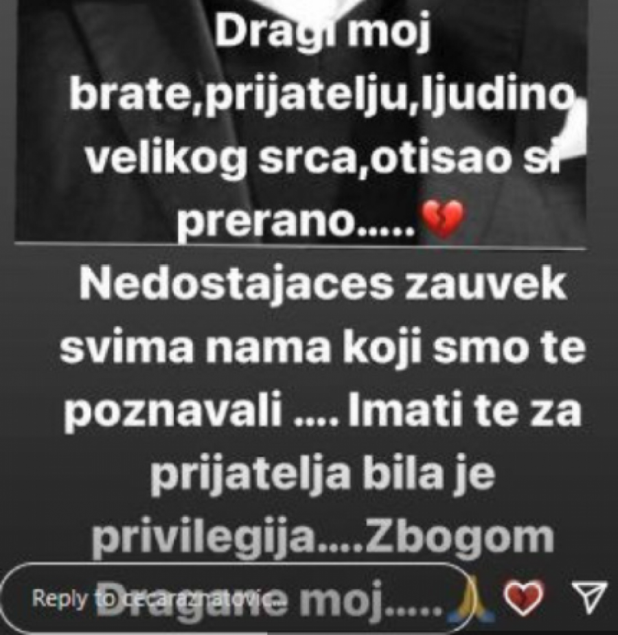 - Dragi moj brate, prijatelju, ljudino velikog srca, otišao si prerano... Nedostajaćeš zauvek svima nama koji smo te poznavali... Imati te za prijatelja bila je privilegija... Zbogom, Dragane moj - poručila je Ceca uz fotografiju Dragana Markovića.