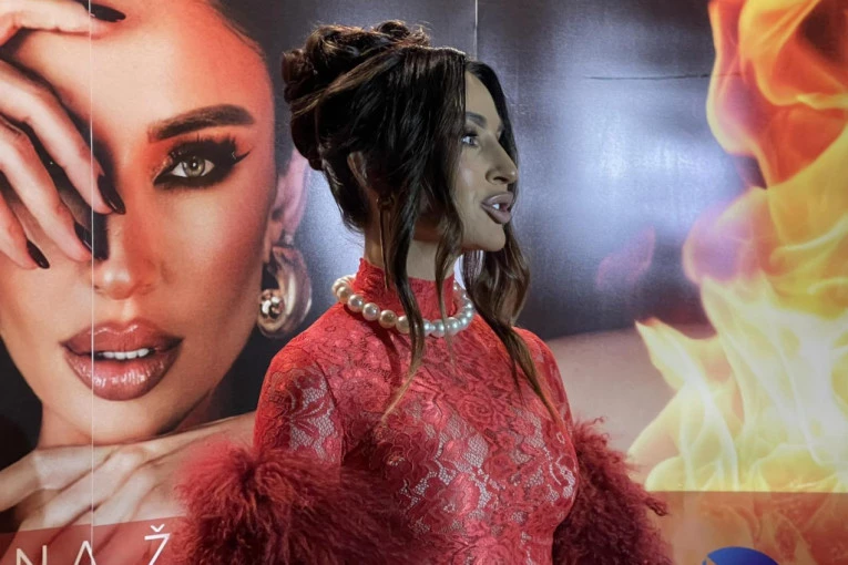 Odevnu kombinaciju upotpunila je masivnim belim biserima oko vrata, kao i bordo efektnom bundom i torbom iste boje. Nakon dolaska, pozirala je okupljenim novinarima i podršku joj pružio poznati estradni menadžer Goran Lečić Leka.