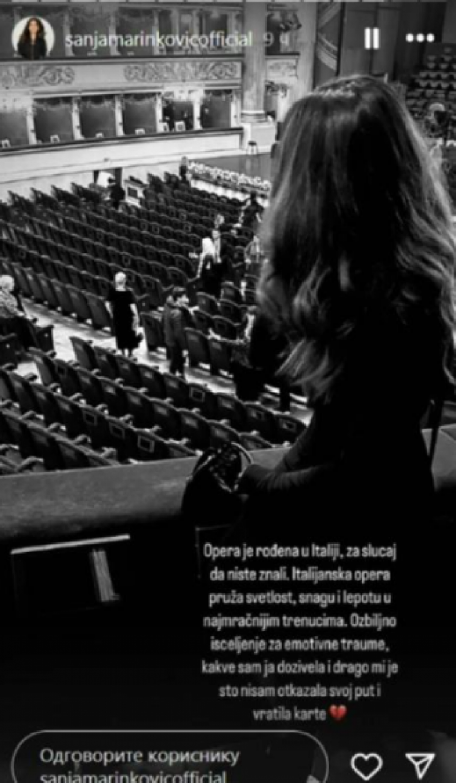 - Opera je rođena u Italiji, za slučaj da niste znali. Italijanska opera pruža svetlost, snagu i lepotu u najmračnijim trenucima. Ozbiljno isceljenje emotivne traume, kakve sam ja doživela i drago mi je što nisam otkazala svoj put i vratila karte - napisala je Sanja uz fotografiju sa opere i dodala emotikon slomljenog srca.