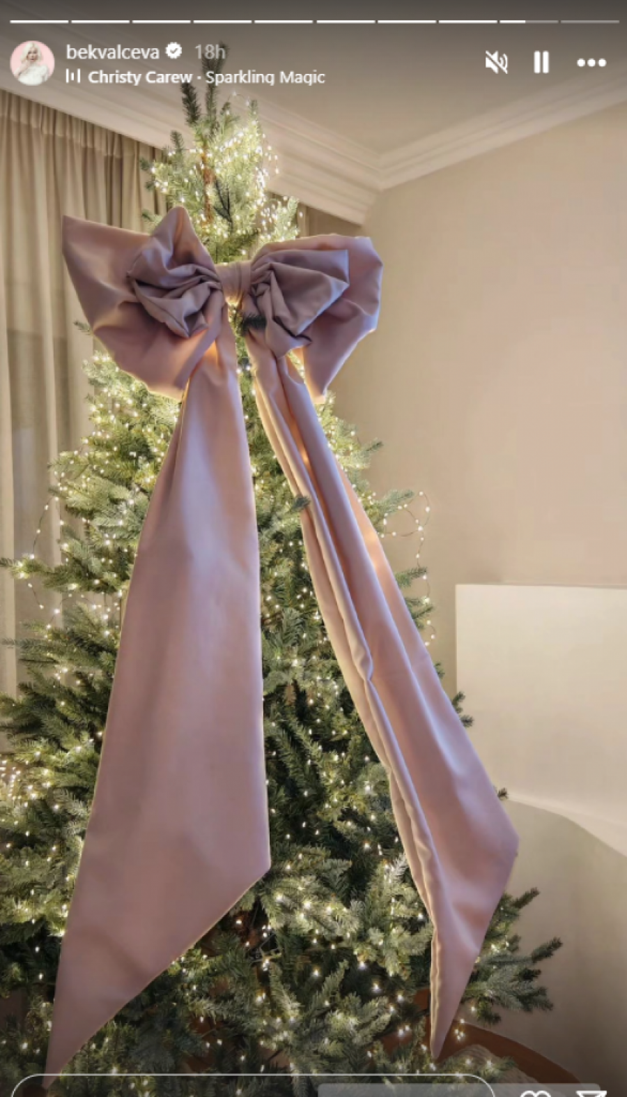 Jelka je impresivne veličine i doseže do samog plafona, a ono što je posebno izdvojilo ovu dekoraciju u moru drugih jeste ogromna mašna roze boje, umesto tradicionalnih ukrasa.