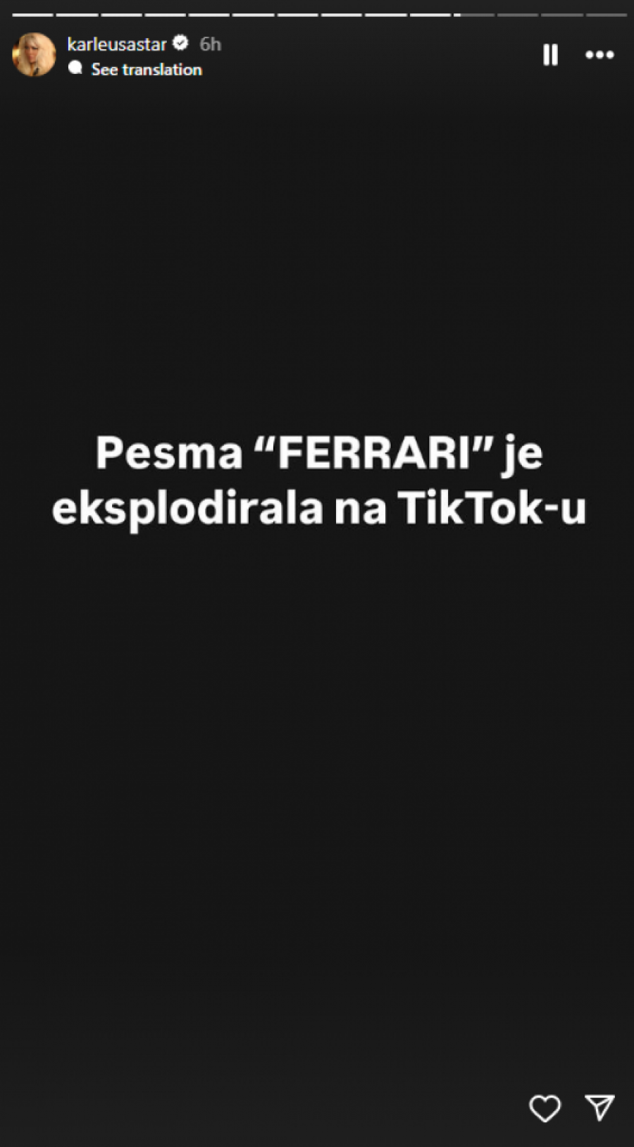 - Pesma "Ferrari" je eksplodirala na TikToku - napisala je Karleuša, pa objavila snimak sa televizije Pink i njen nastup uz ovu pesmu u emisiji "Amidži šou":