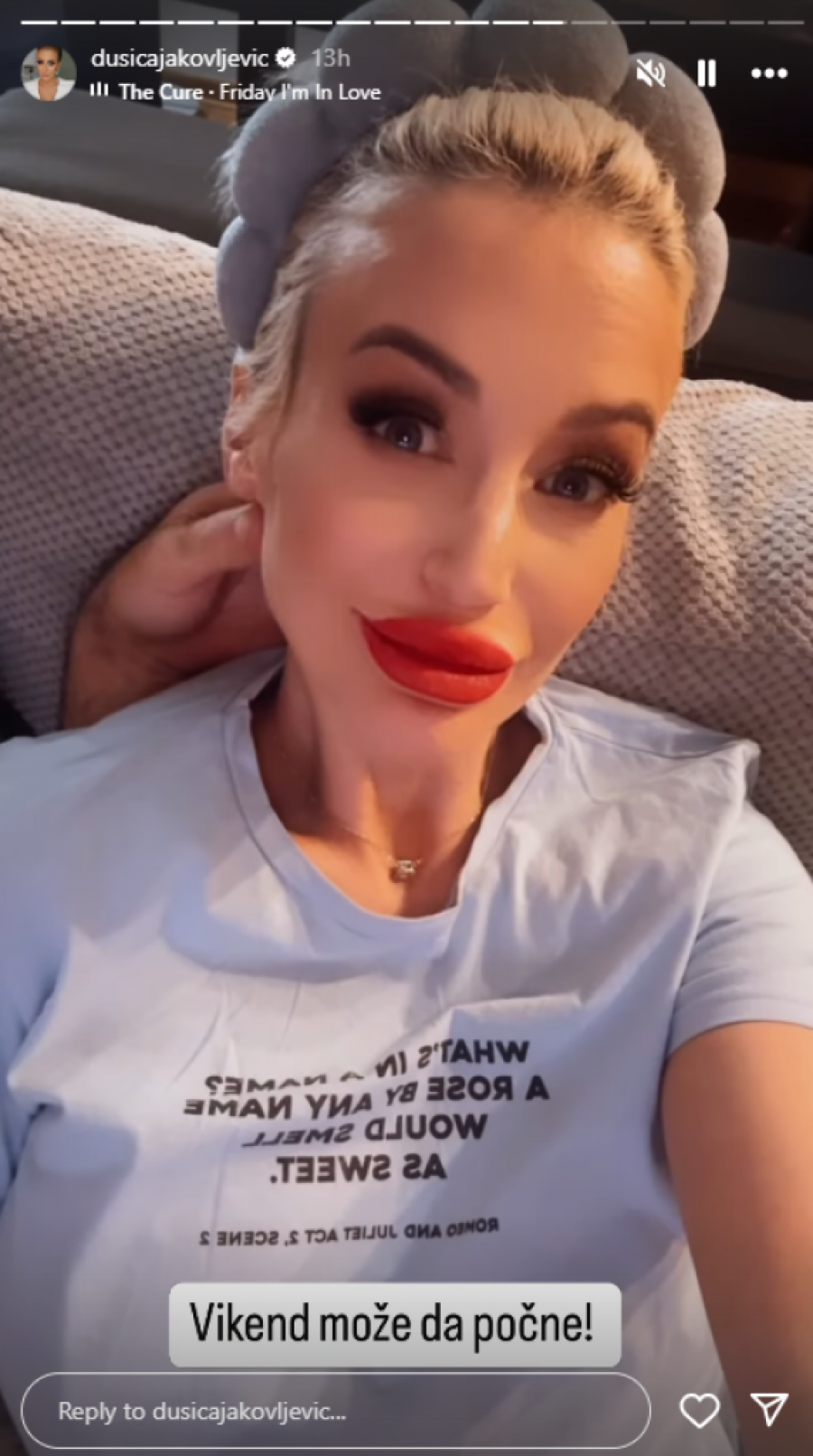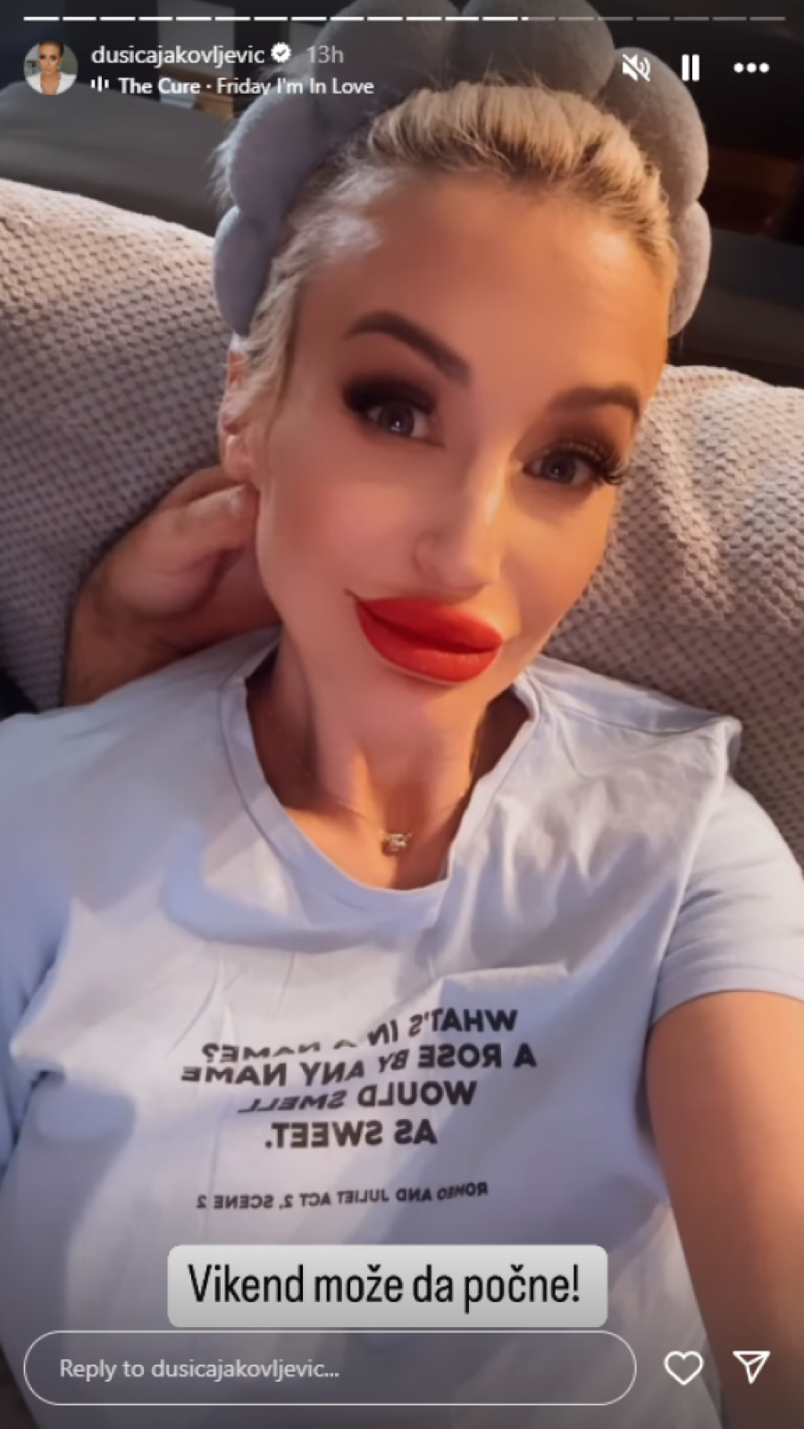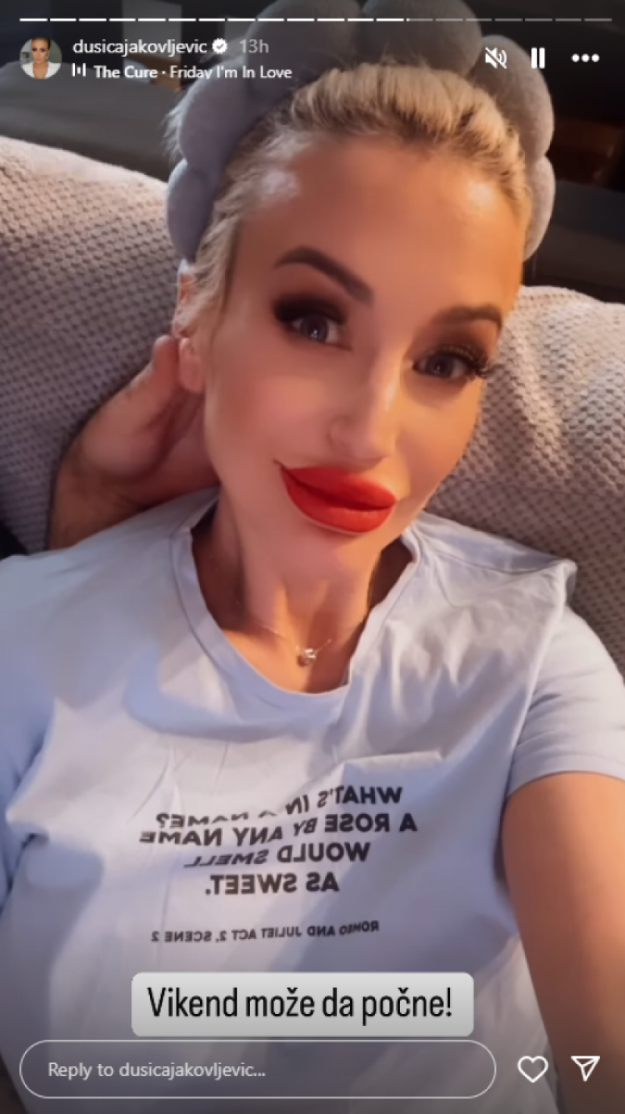 - Vikend može da počne - napisala je Dušica preko svog snimka i dodala pesmu "Friday I'm In Love" (petak je, ja sam zaljubljen), koju izvodi kultna grupa The Cure.