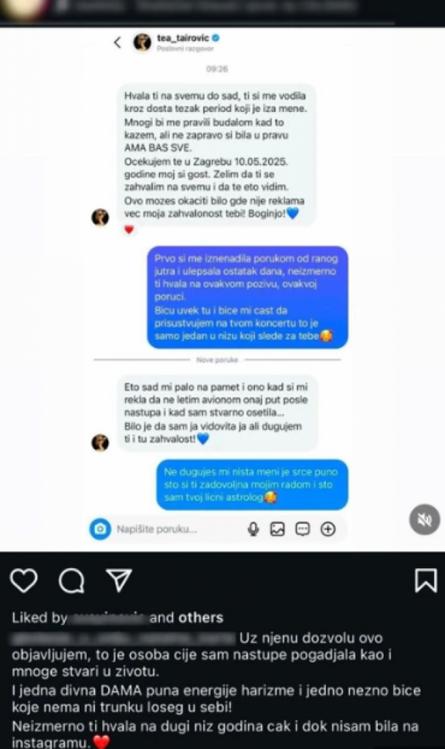 - Hvala ti na svemu do sada, ti si me vodila kroz dosta težak period koji je iza mene. Mnogi bi me pravili budalom kad to kažem, ali zapravo, ti si bila u pravu – ama baš sve - napisala je, navodno, Tea Tairović, te je pozvala vidovitu ženu na svoj koncert:
