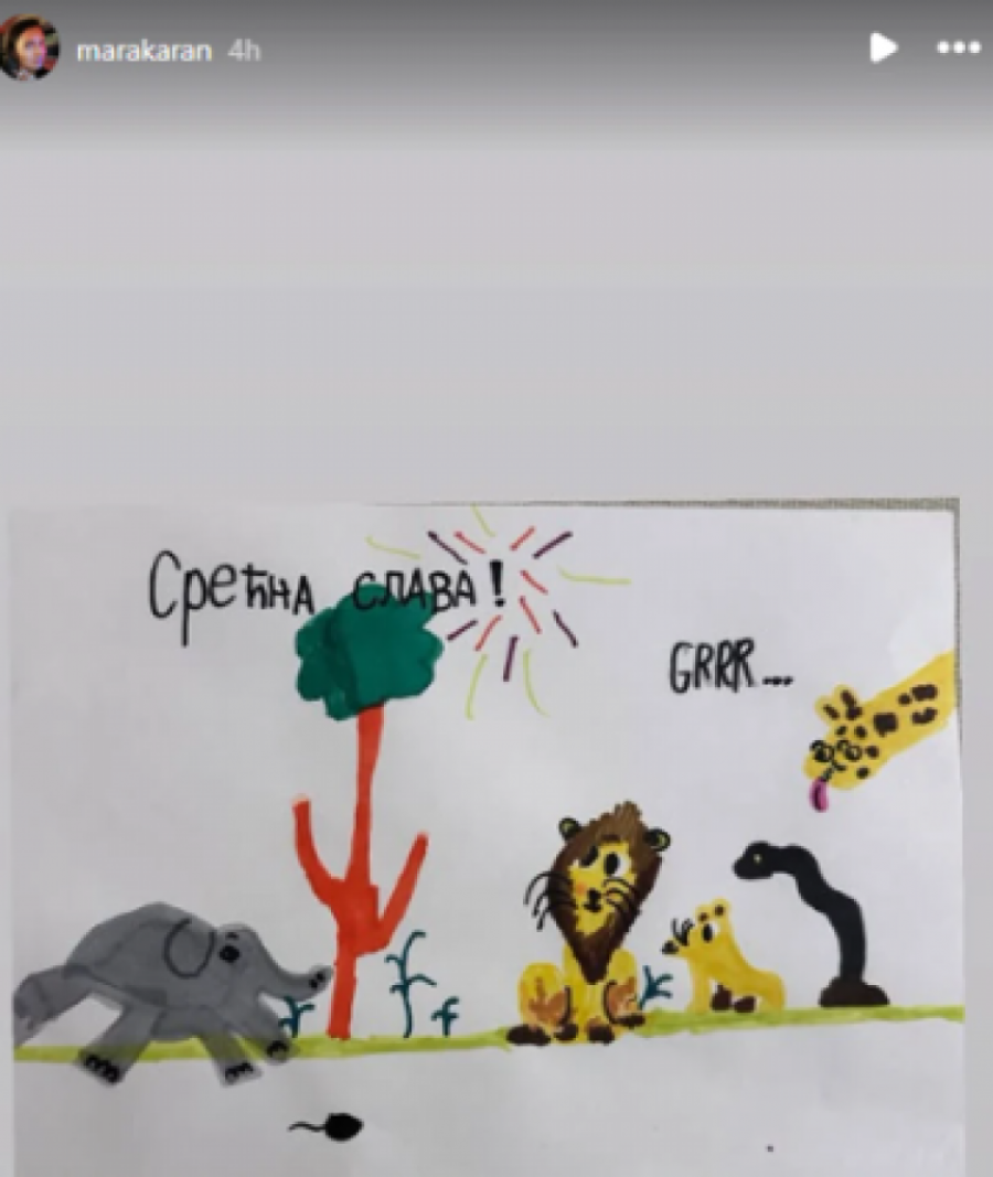 Poznata glumica Marija Karan večeras je iznenadila javnost neobičnim gestom čestitanja slave. Naime, ona je podelila dečji crtež na kome su prikazane divlje životinje, a prema njenim rečima, crtež je delo njenog sina Marka Lea. Ovaj gest izazvao je različite reakcije pratilaca na društvenim mrežama i pokazala Marijinu toplu, porodičnu stranu.