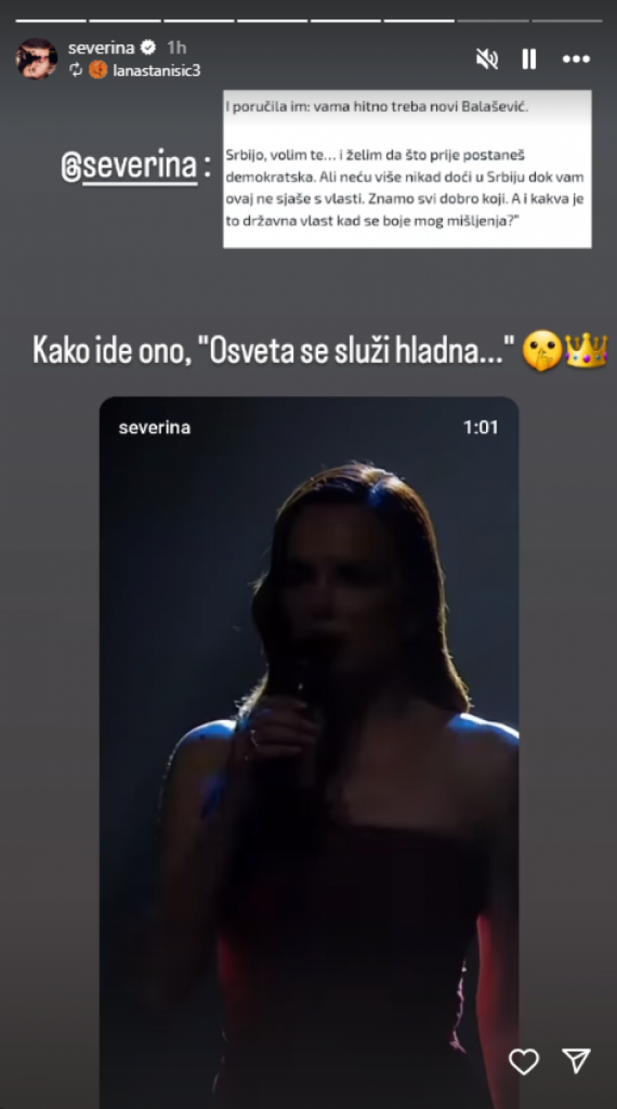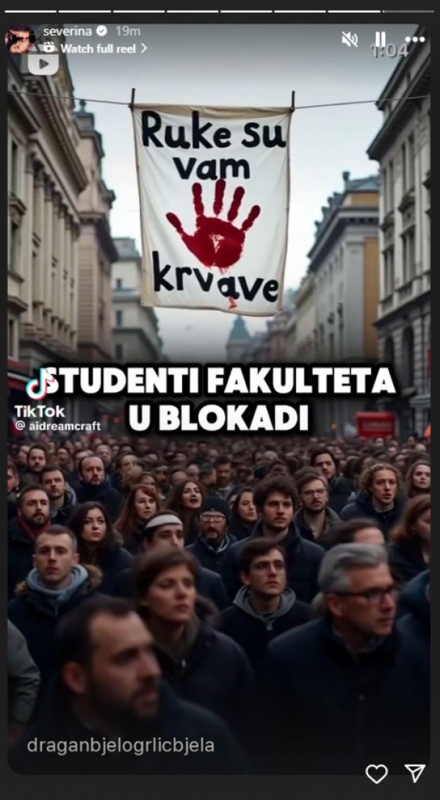 Dok se dešava tragedija u Zagrebu, hrvatska pevačica Severina Vučković bavi se situacijom u Srbiji, pa je tako u poslednji sat vremena na njenom profilu osvanuo veštački generisan snimak o protestima, njena izjava o tome da više nikad neće doći u našu zemlju, ali i reklama na kojoj Severina poklanja fanovima parfeme, mirisne sveće, šampone, kupke i mirise za kuću.
