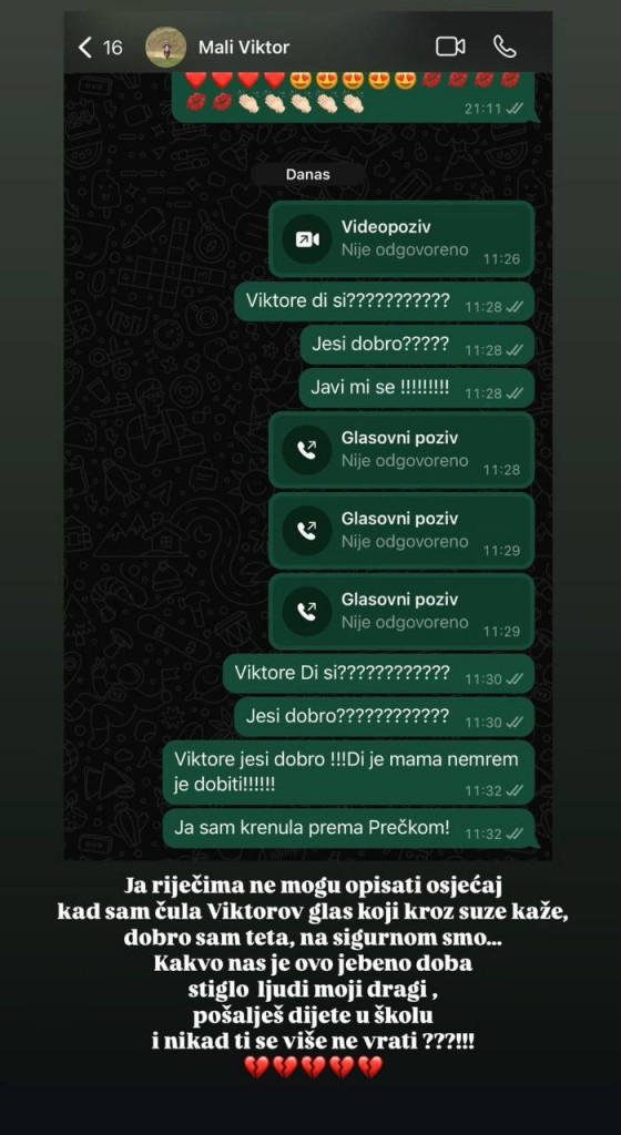 - Ja rečima ne mogu da opišem osećaj kad sam čula Viktorov glas koji kroz suze kaže: Dobro sam, teto, na sigurnom smo...". Kakvo nas je ovo j*beno doba stiglo, ljudi moj dragi, pošalješ dete u školu i nikada ti se više ne vrati???!!! - dopisala je ona i stavila nekoliko emotikona slomljenog srca.