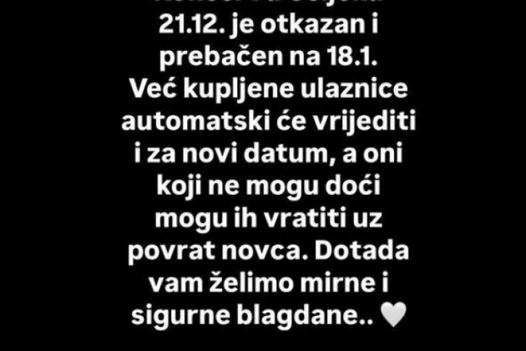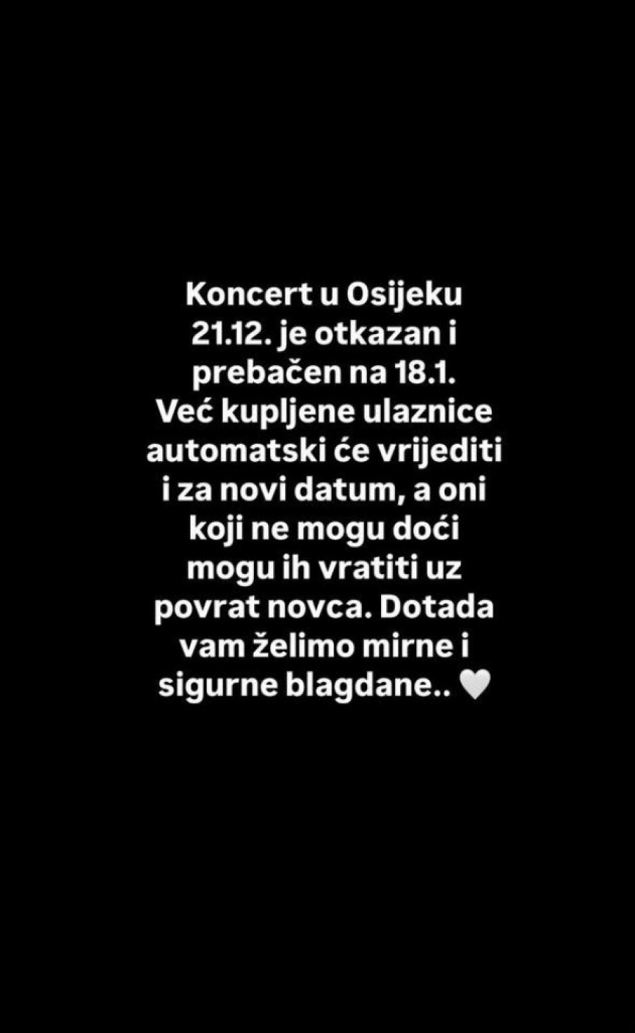 - Koncert u Osijeku 21.12. je otkazan i prebačen za 18.01. Sve kupljene ulaznice će automatski važiti i za novi datum, a oni koji ne mogu doći, dobiće povrat novca. Do tada vam želimo mirne praznike - stoji u sopštenju.