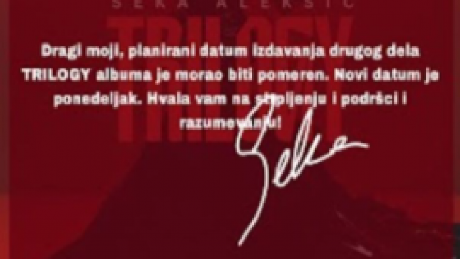 - Dragi moji, planirani datum izdavanja drugog dela TRILOGY albuma je morao biti pomeren. Novi datum je ponedeljak. Hvala vam na strpljenju, podršci i razumevanju - poručila je Seka u pomenutoj objavi.