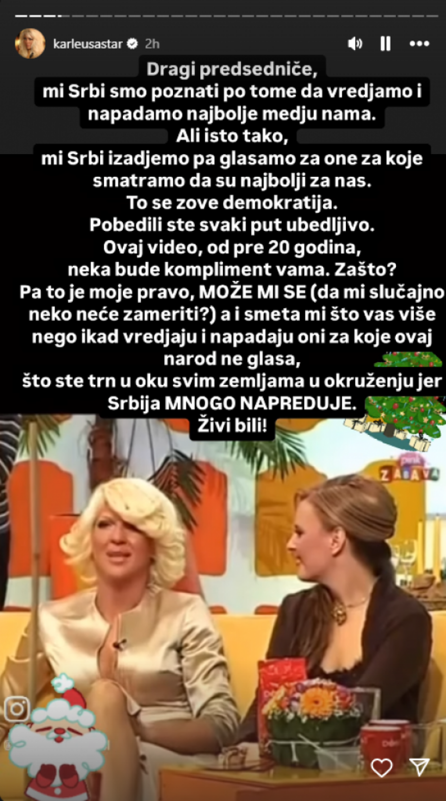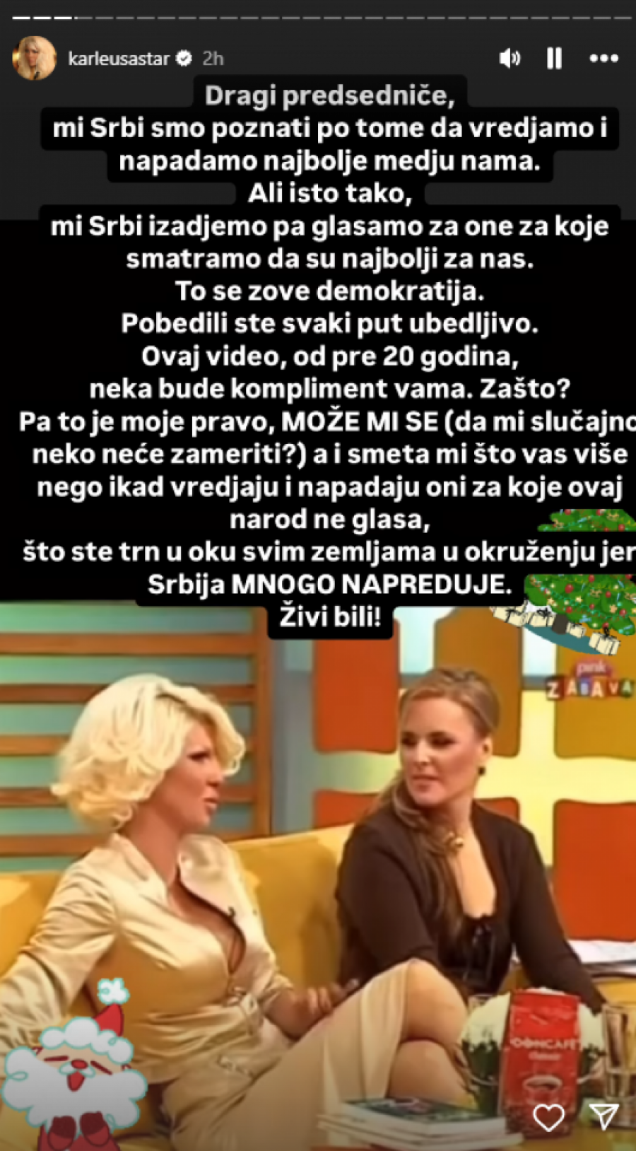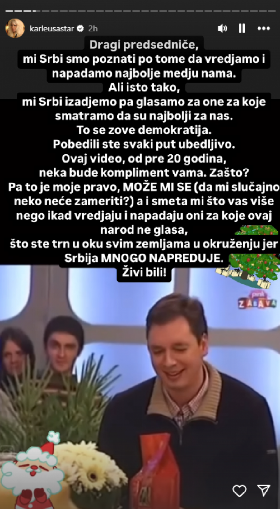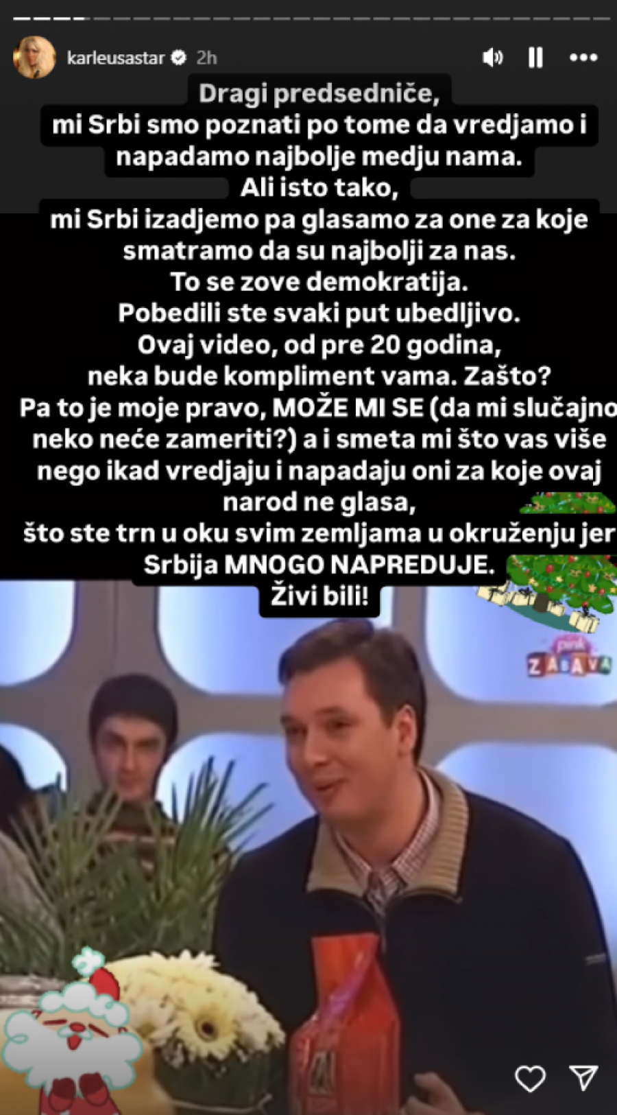 - Dragi predsedniče, mi Srbi smo poznati po tome da vređamo i napadamo najbolje među nama. Ali isto tako, mi Srbi izađemo, pa glasamo za one za koje smatramo da su najbolji za nas. To se zove demokratija. Pobedili ste svaki put ubedljivo. Ovaj video, od pre 20 godina, neka bude komplimen vama. Zašto? Pa to je moje pravo, MOŽE MI SE (da mi slučajno neko neće zameriti?) a i smeta mi što vas više nego ikad vređaju i napdaju opni za koje ovaj narod ne glasa, što ste trn u oku svim zemljama u okruženju jer Srbija MNOGO NAPREDUJE. Živi bili! - poručila je Jelena.