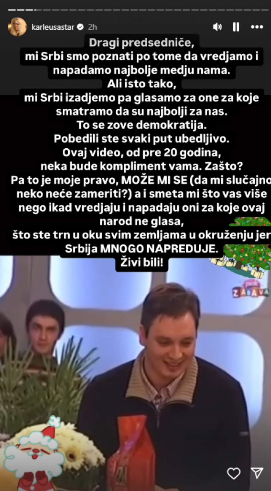 - Aca zna da je on jedan od mojih omiljenih, ako ne i najomiljeniji političar. Tako da ja ne mogu da budem provokativna u pitanjima. Postaviću jedno lepo, blago pitanje - da li je Aca svestan da je šarmantan i koliko njegov fizički izgled deluje na biračko telo i da li koristi svoj izgled i šarm kad je politika u pitanju? - pitala je Karleuša Vučića tada.