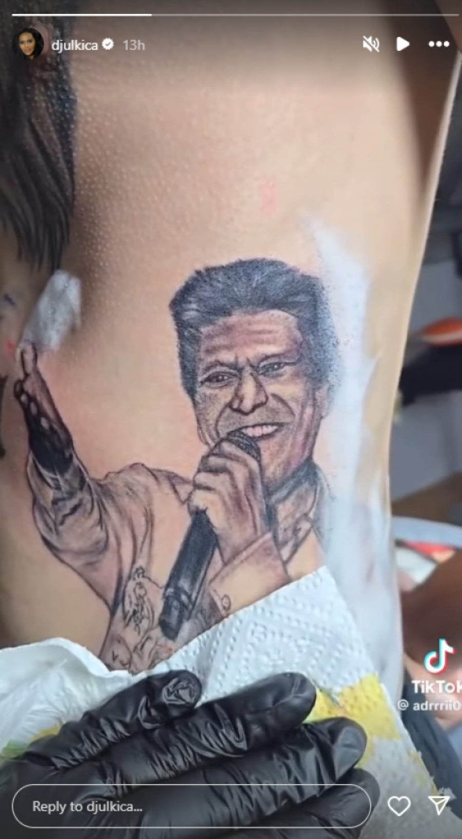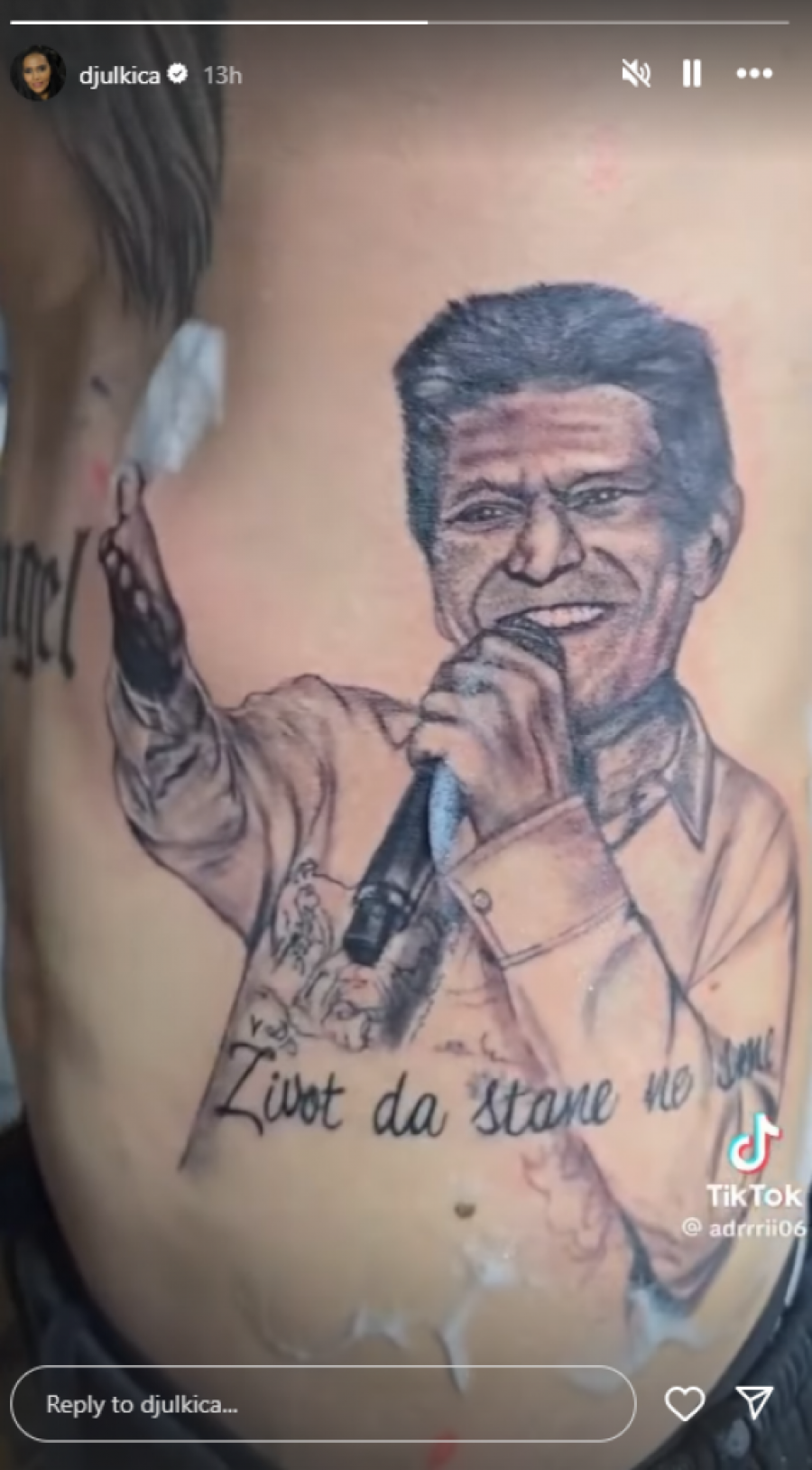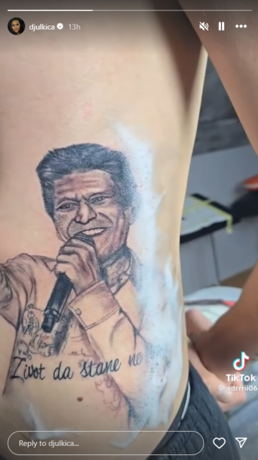 Đulkica Sakić Amzić, ćerka pokojnog pevača Sinana Sakića, objavila je zanimljiv snimak na društvenoj mreži Instagram, na kom se vidi telo jednog mladića, koji je istetovirao lik njenog pokojnog oca ispod ruke. Na tetovaži je Sinan nasmejan, drži mikrofon i peva, a ispod njega stoje reči "život da stane ne sme".