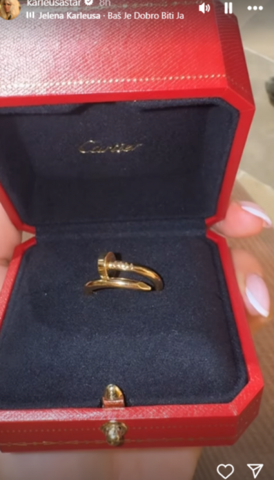 Pevačica Jelena Karleuša je dobila poklon koji je izazvao dosta pažnje javnosti. Naime, popularna pop diva je danas, 31. decembra, podelila sa svojim pratiocima na društvenim mrežama sliku zlatnog prstena koji je dobila kao poklon. Prsten je bio upakovan u kutiju brenda nakita "Cartier", a sama pojava ovog luksuznog komada izazvala je pravu pometnju.