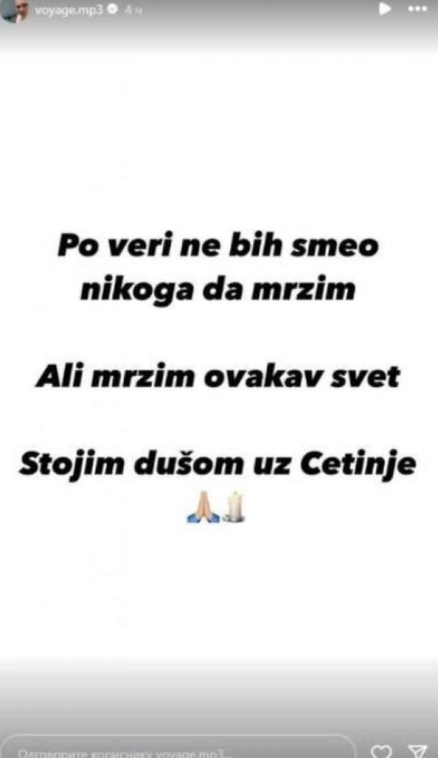 "Po veri ne bih smeo nikoga da mrzim, ali mrzim ovakav svet. Stojim dušom uz Cetinje", napisao je muzičar.