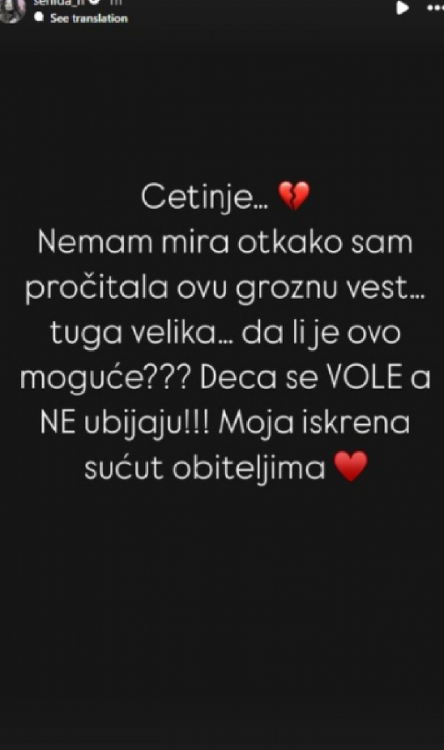 - Cetinje... Nemam mira otkako sam pročitala ovu groznu vest. Velika tuga. Da li je ovo moguće? Deca se vole, a ne ubijaju! Moje iskreno saučešće porodicama - napisala je Senidah, koja je ovaj strašan događaj duboko doživela.