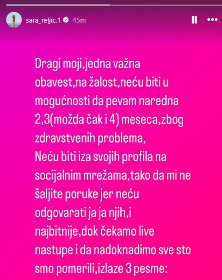 Sarina mama istakla je da je zdravlje pevačice na prvom mestu i da hitna operacija nije mogla da se odloži. Ova situacija ukazuje na važnost brige o zdravlju i potrebu da se adekvatno reaguje u slučaju zdravstvenih problema.