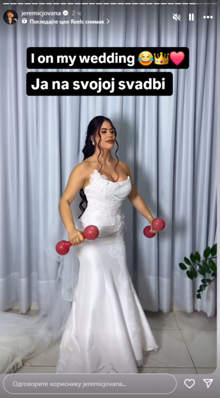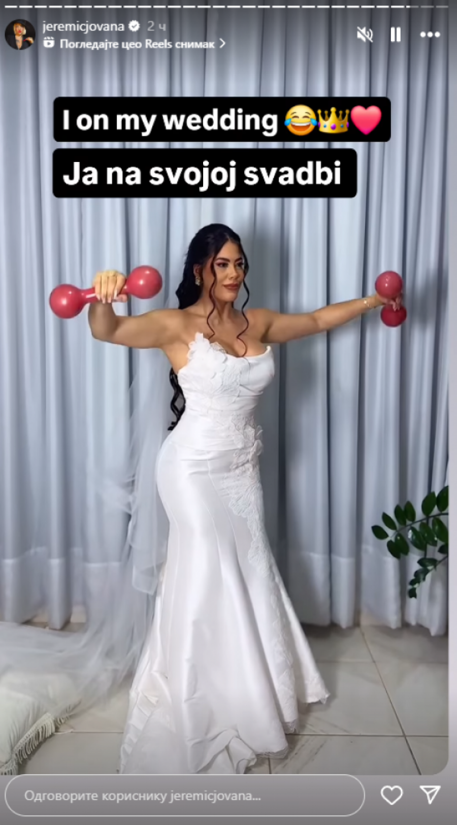 Jovana Jeremić je sada objavila snimka devojke koja u venčanici diže tegove, pa je otkrila da upravo tako planira ona da izgleda na svojoj svadbi sa Draganom, koja je najavljena za narednu godinu.