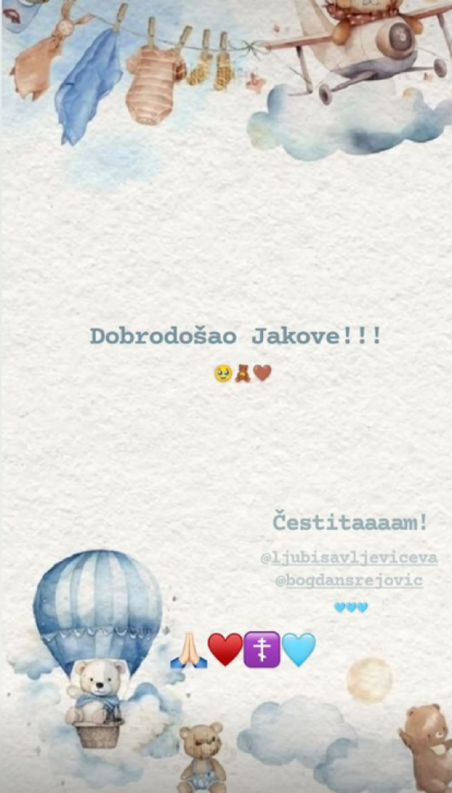 Naime, ponosni roditelji su na Instagramu su tek nakon Jovaninog porođaja podelili čestitku na kojoj stoji: "Dobrodošao Jakove".