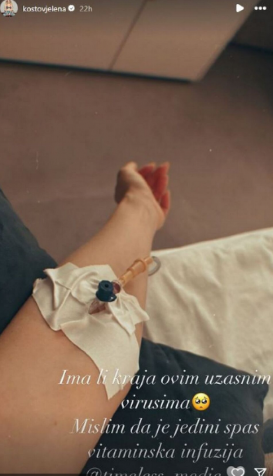 - Ima li kraja ovim užasnim virusima? Mislim da je jedini spas vitaminska infuzija - napisala je Jelena pokazavši infuziju koju prima u vene.