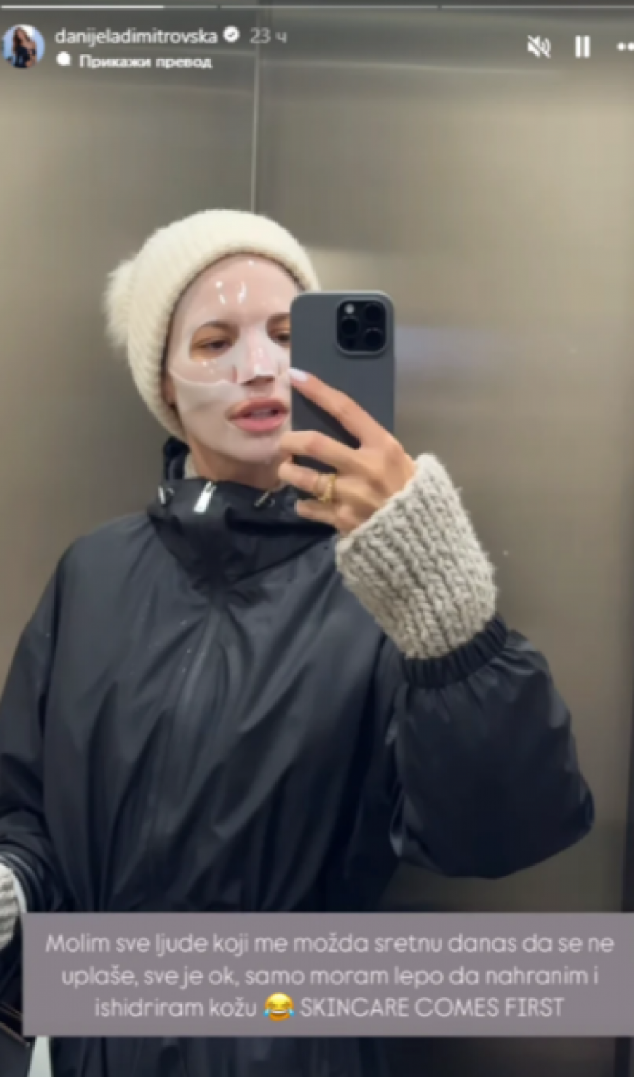 - Molim sve ljude koji me možda sretnu danas da se ne uplaše, sve je ok, samo moram lepo da nahranim i ishidriram kožu - napisala je Danijela Dimitrovska uz šaljiv snimak.