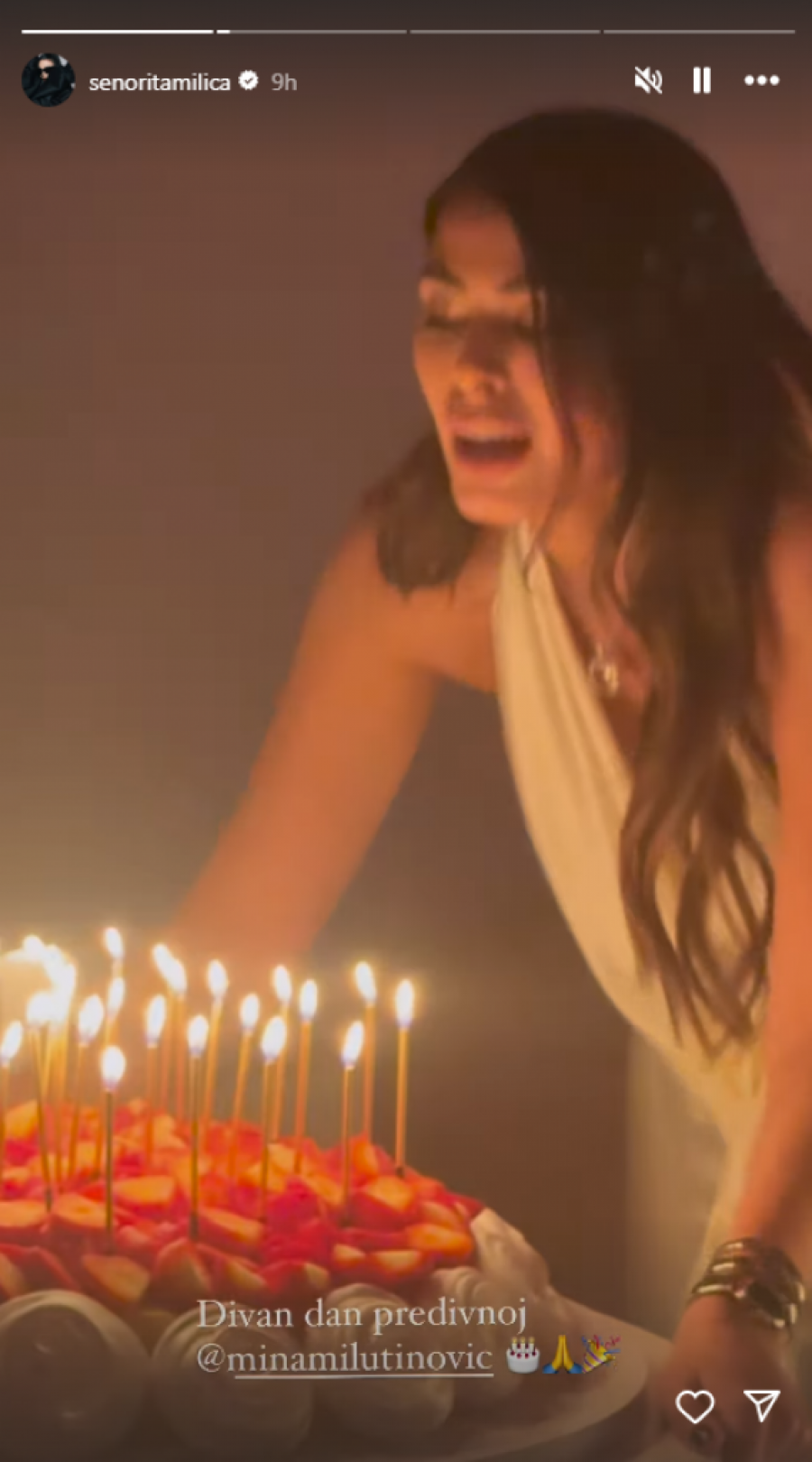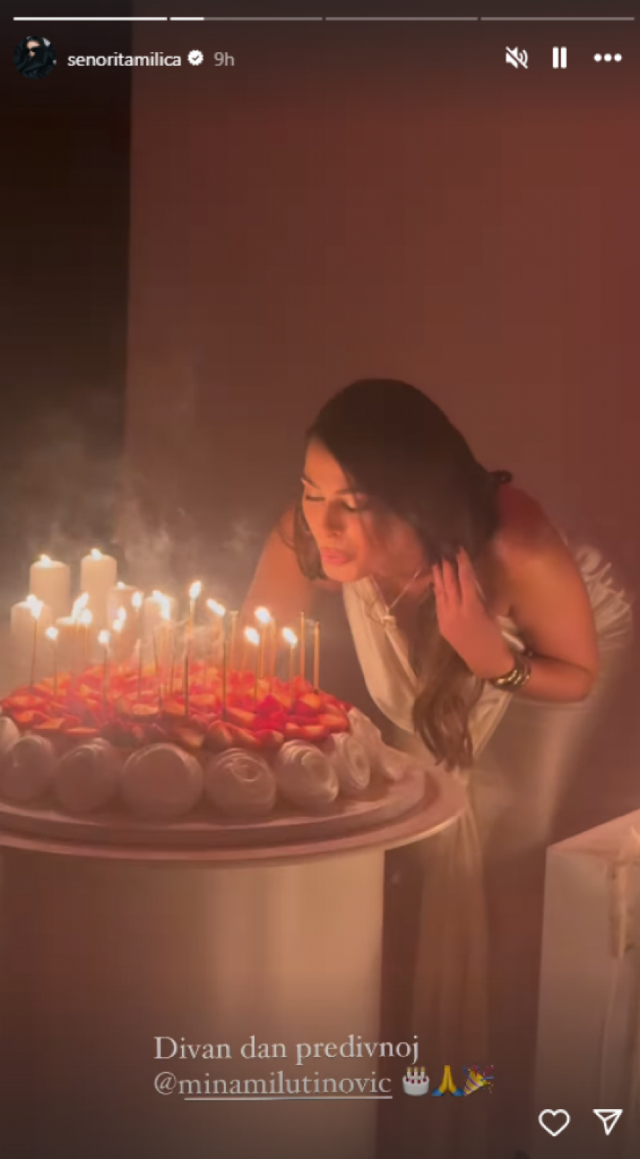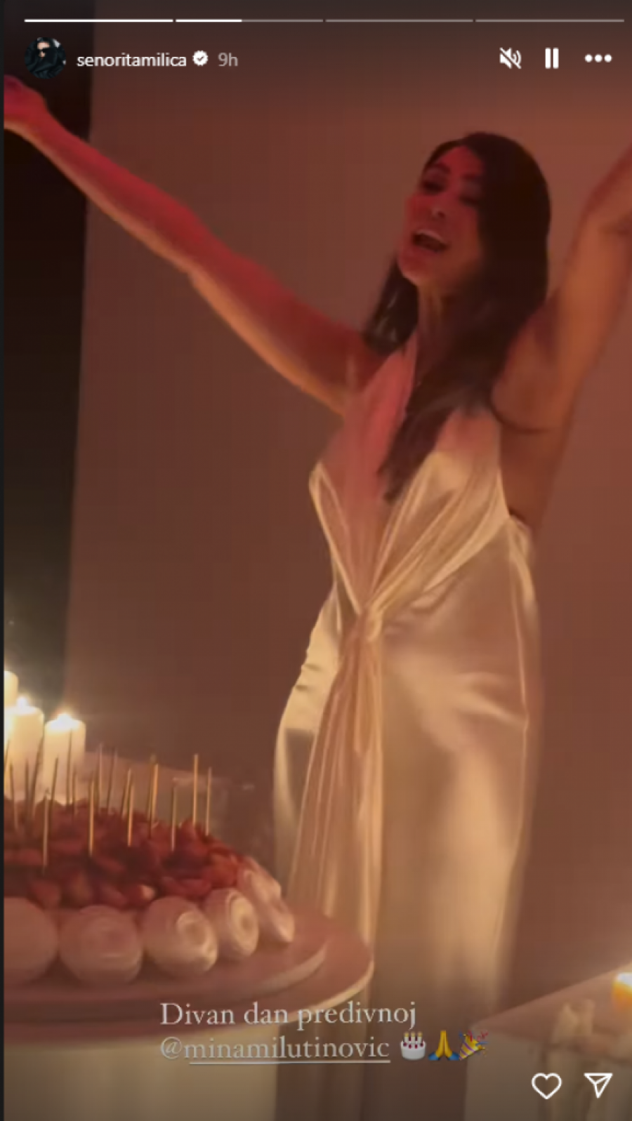 Milutinovićeva je nosila dugu, belu haljinu, koja je istakla njene atribute. Torta je bila ukrašena breskvama, a svuda oko nje nalazile su se sveće. Mina je oduvala svećice, a zvanice su je podržale aplauzom. Sve ovo je zabeležila pevačica Milica Pavlović, koja je bila jedna od zvanica.