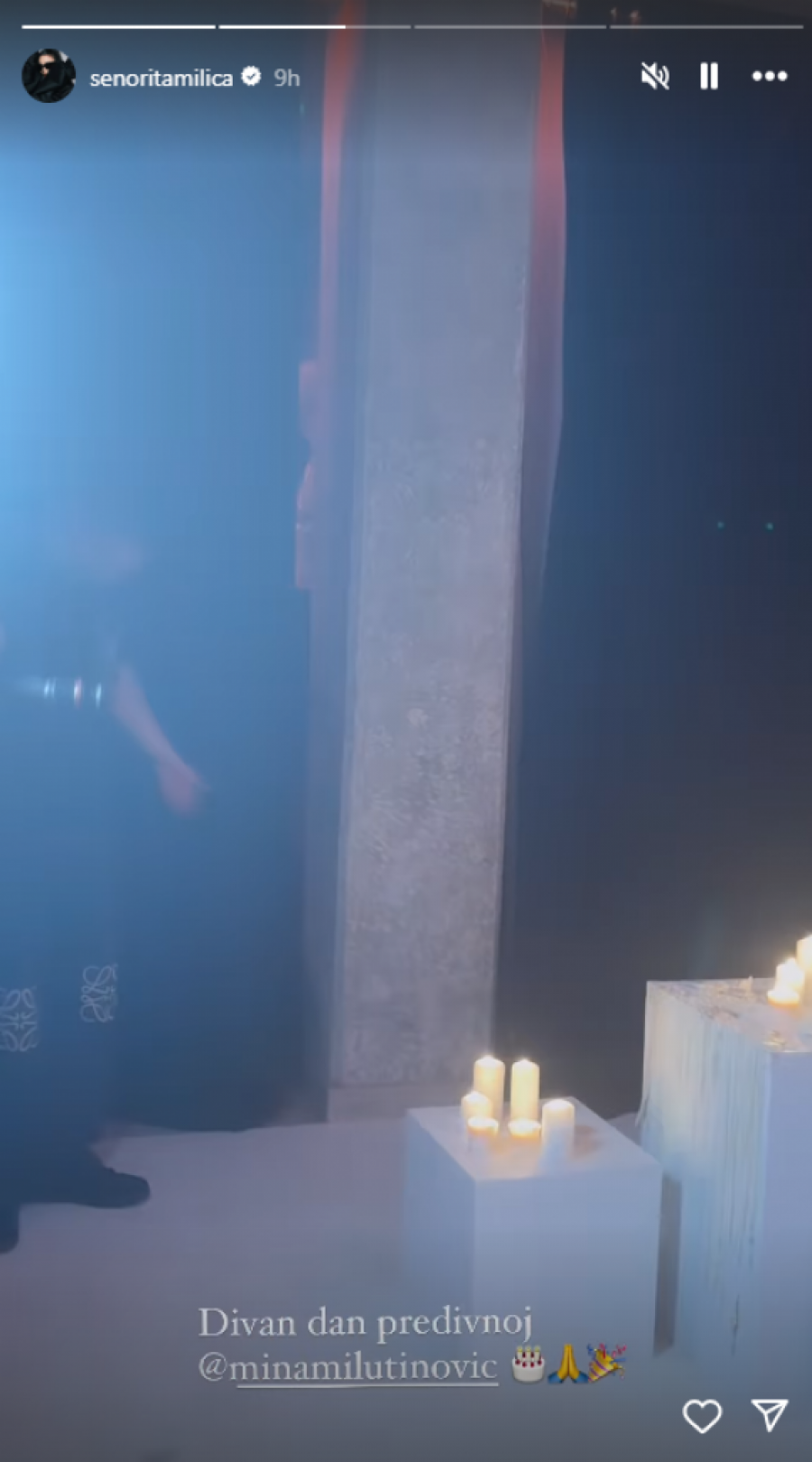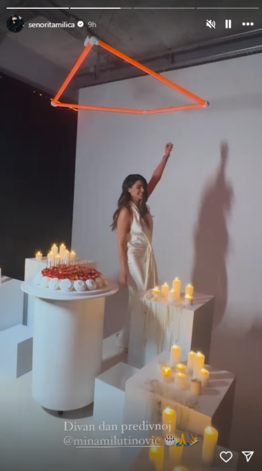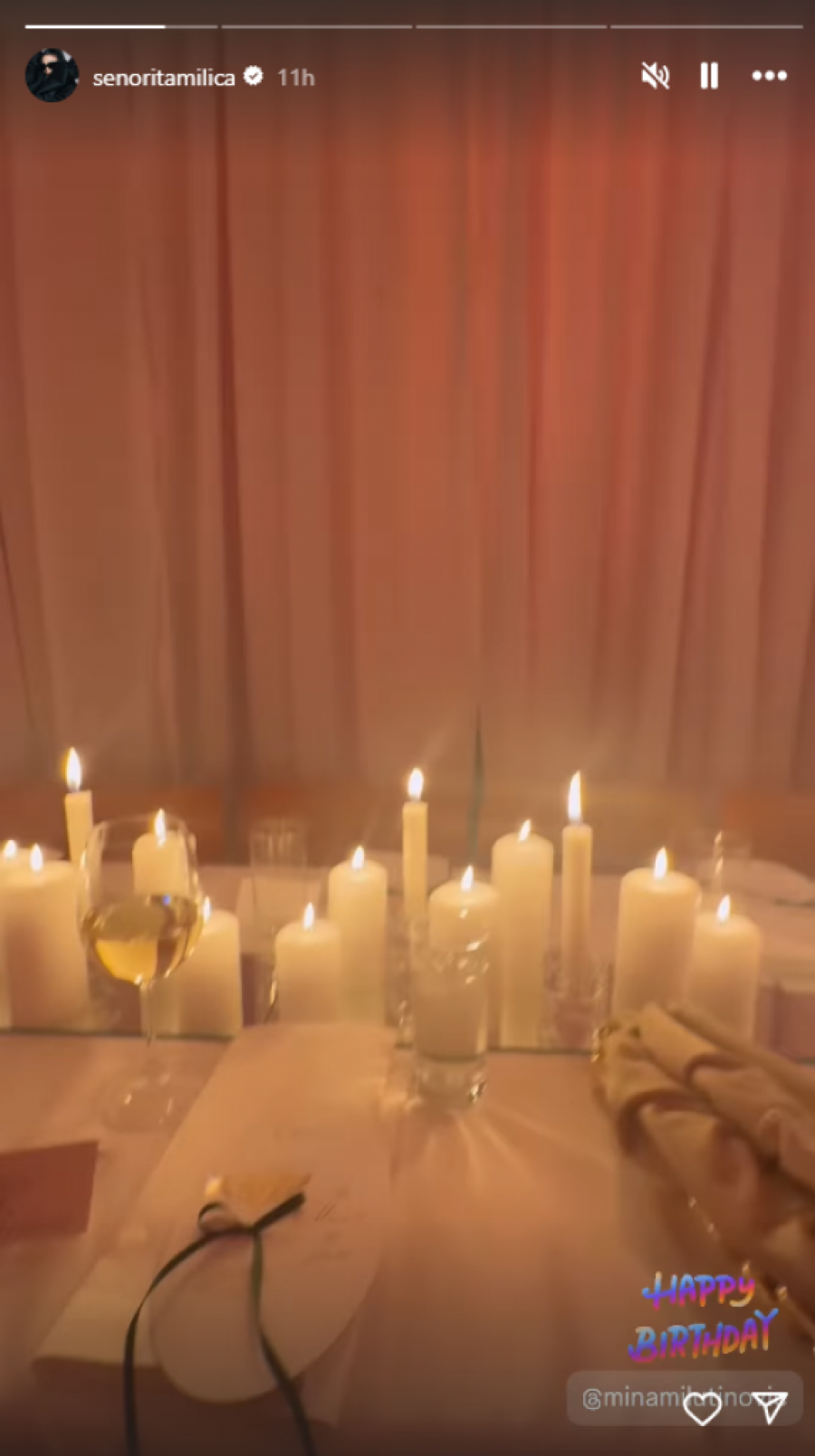 Milutinovićeva je nosila dugu, belu haljinu, koja je istakla njene atribute. Torta je bila ukrašena breskvama, a svuda oko nje nalazile su se sveće. Mina je oduvala svećice, a zvanice su je podržale aplauzom. Sve ovo je zabeležila pevačica Milica Pavlović, koja je bila jedna od zvanica.