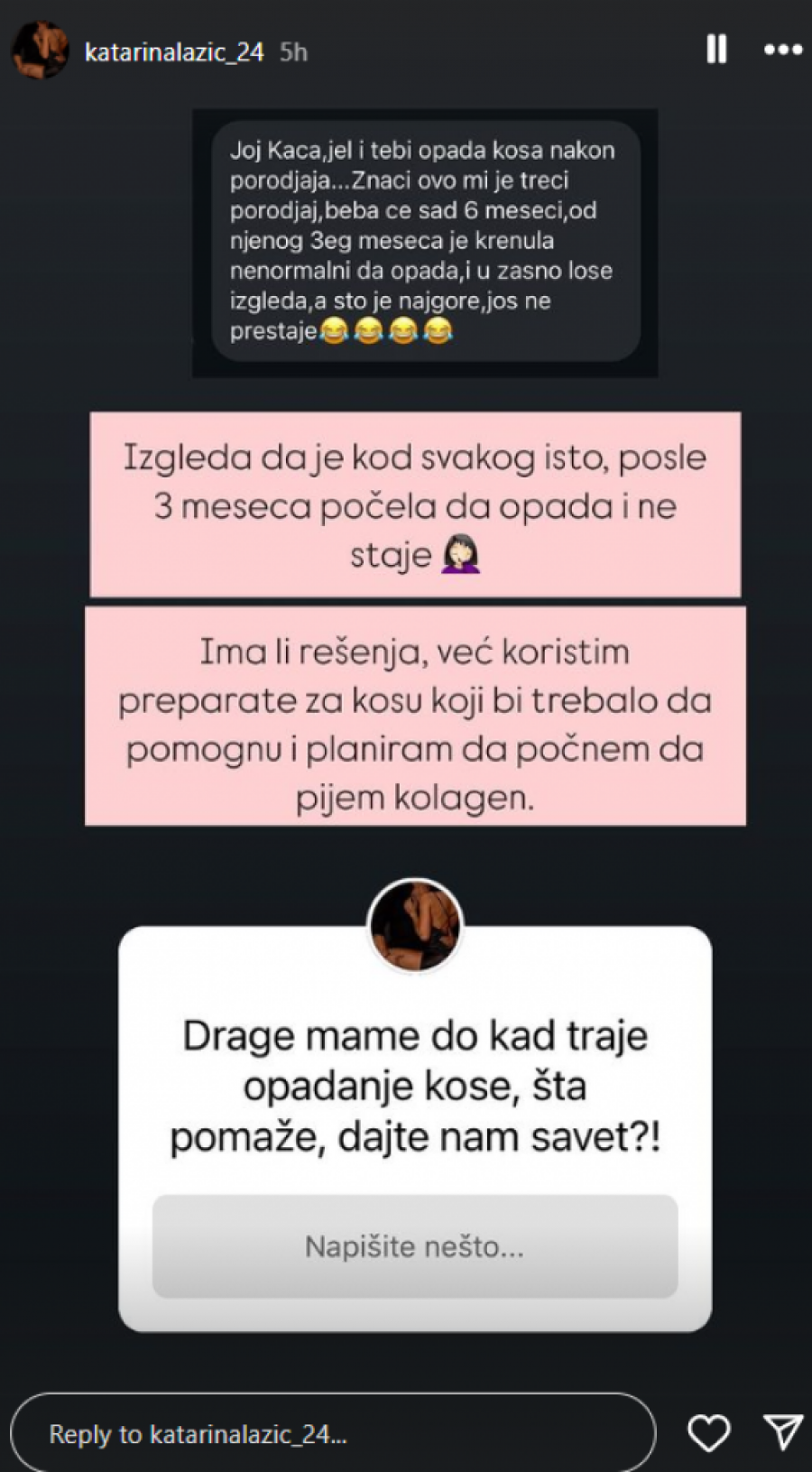 - Drage mame, do kada traje opadanje kose, šta pomaže, dajte savet?- napisala je Katarina i dodala: