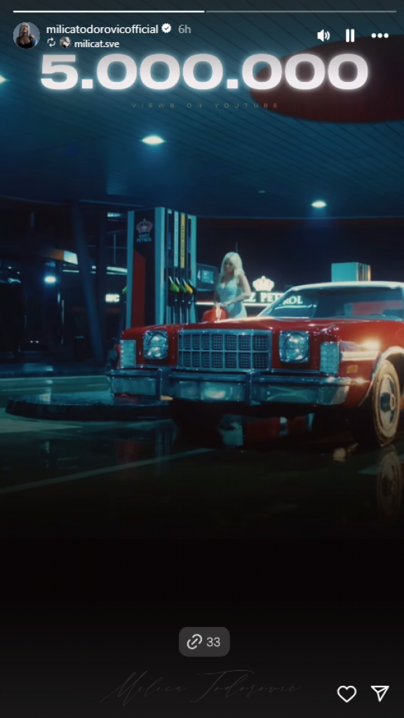 Popularna pevačica Milica Todorović ima poseban razlog za slavlje. Kako se pohvalila na društvenoj mreži Instagram, njena pesma "33" ima pet miliona pregleda na platformi Jutjub, što je veliki uspeh. Iako ju je izbacila pre četiri meseca, ova pesma se i dalje nalazi u trending listi i to na 63. mestu.