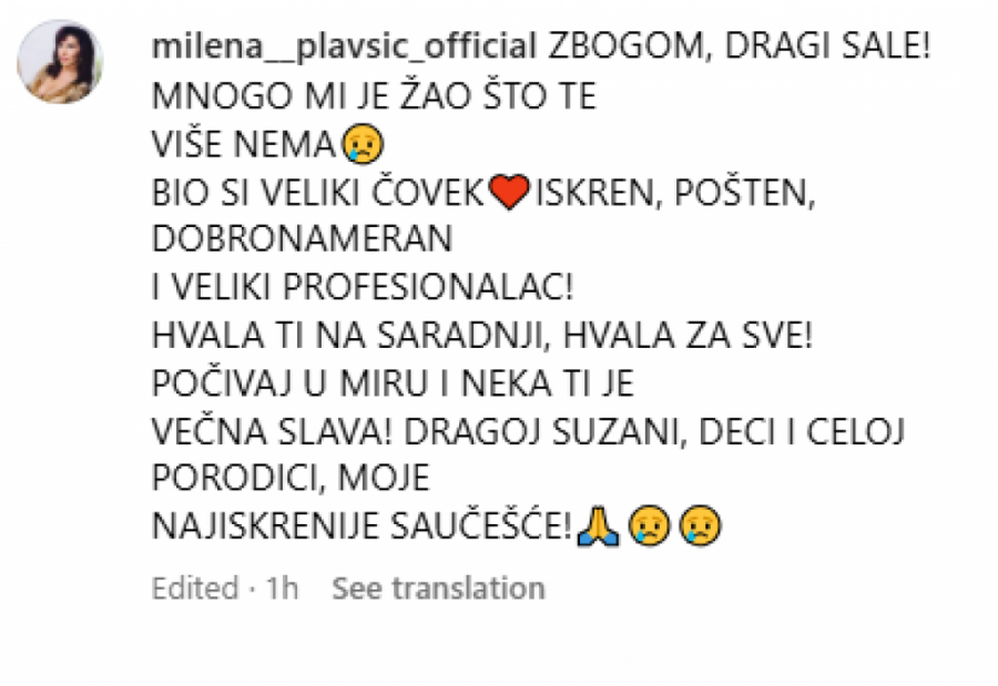 - Zbogom dragi Sale, mnogo mi je žao što te više nema. Bio si veliki čovek, iskren, pošten dobronameran i veliki profesionalac. Hvala ti na saradnji, hvala ti za sve. Počivaj u miru i neka ti je večna slava. Suzani i celoj porodici moje najiskrenije saučešće - napisala je ona na društvenoj mreži Instagram.
