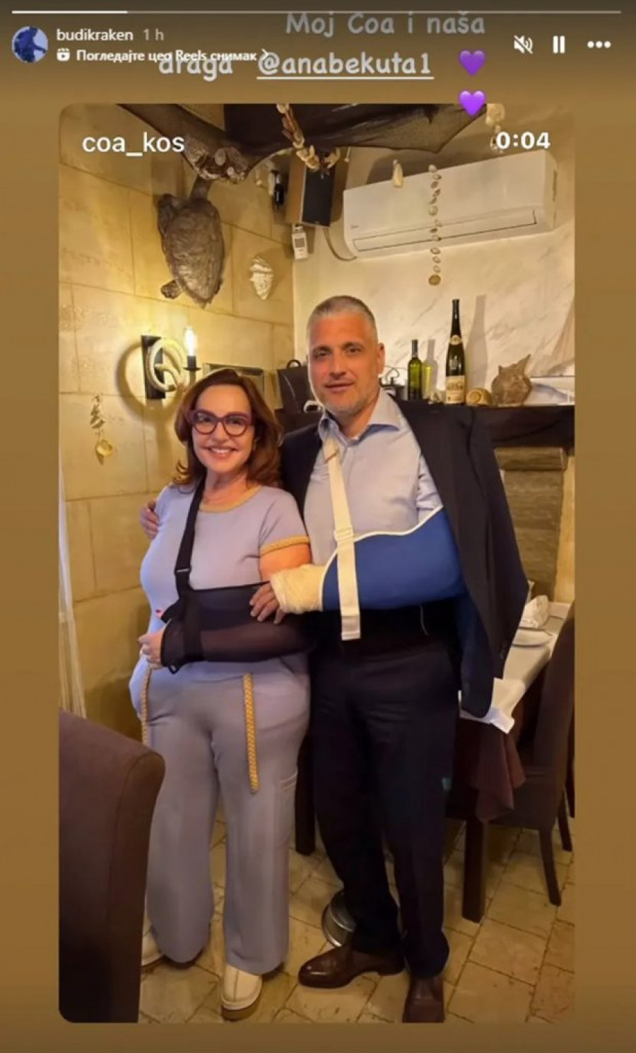 Na slici, oboje su se prikazali u opuštenom izdanju, što dodatno ističe njihovu bliskost. Ana Bekuta je skinula gips sa ruke, ali još uvek nosi potporu, dok Čeda Jovanović i dalje nosi gips na ruci, što je zanimljiv detalj koji privlači pažnju. Pevačica je bila u trenerci i majici, bez šminke, dok je Jovanović bio u odelu, što stvara kontrast između njihovih stajlinga. U društvu im se pridružio i Čedin prijatelj Aleksandar Kos, čime je atmosfera na fotografiji postala još neformalnija.