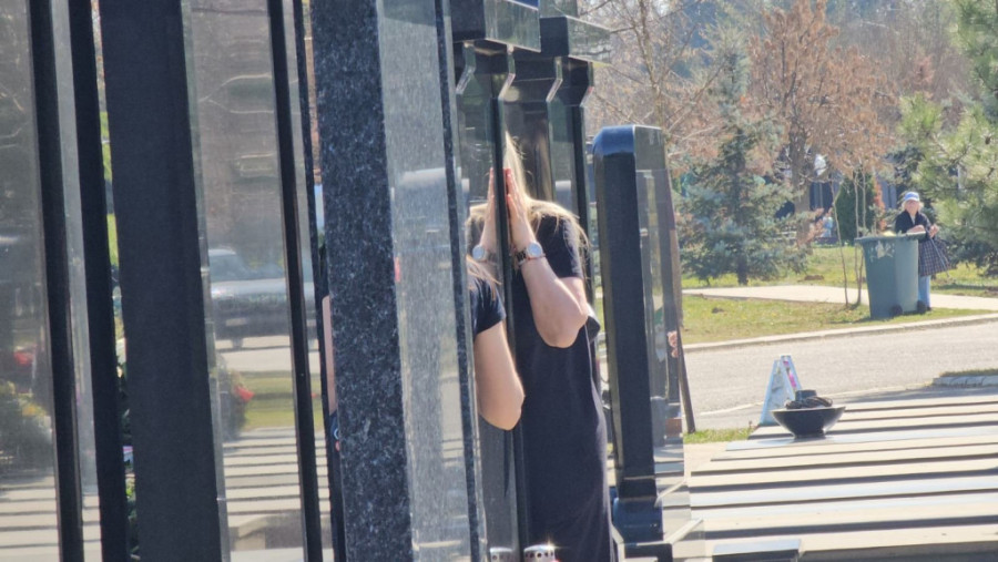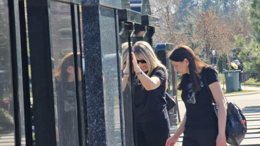 Pre nego je otišla sa groblja, neutešna udovica Saše Popovića prišla je spomeniku, pa krenula da mazi fotografiju preminulog supruga, a podršku joj je pružila i prijateljica, Vesna Milanović, koja je sarađivala sa Sašom.
