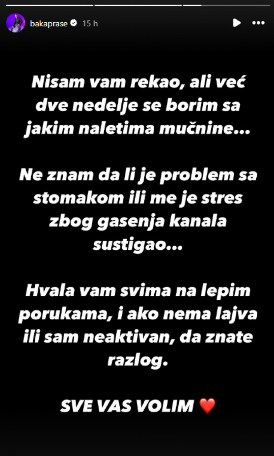 - Nisam vam rekao, ali već dve nedelje se borim sa jakim naletima mučnine... Ne znam da li je problem sa stomakom ili me je stres zbog gašenja kanala sustigao... Hvala vam svima na lepim porukama i ako nema lajva ili sam neaktivan, da znate razlog. Sve vas volim - napisao je Baka u nastavku.