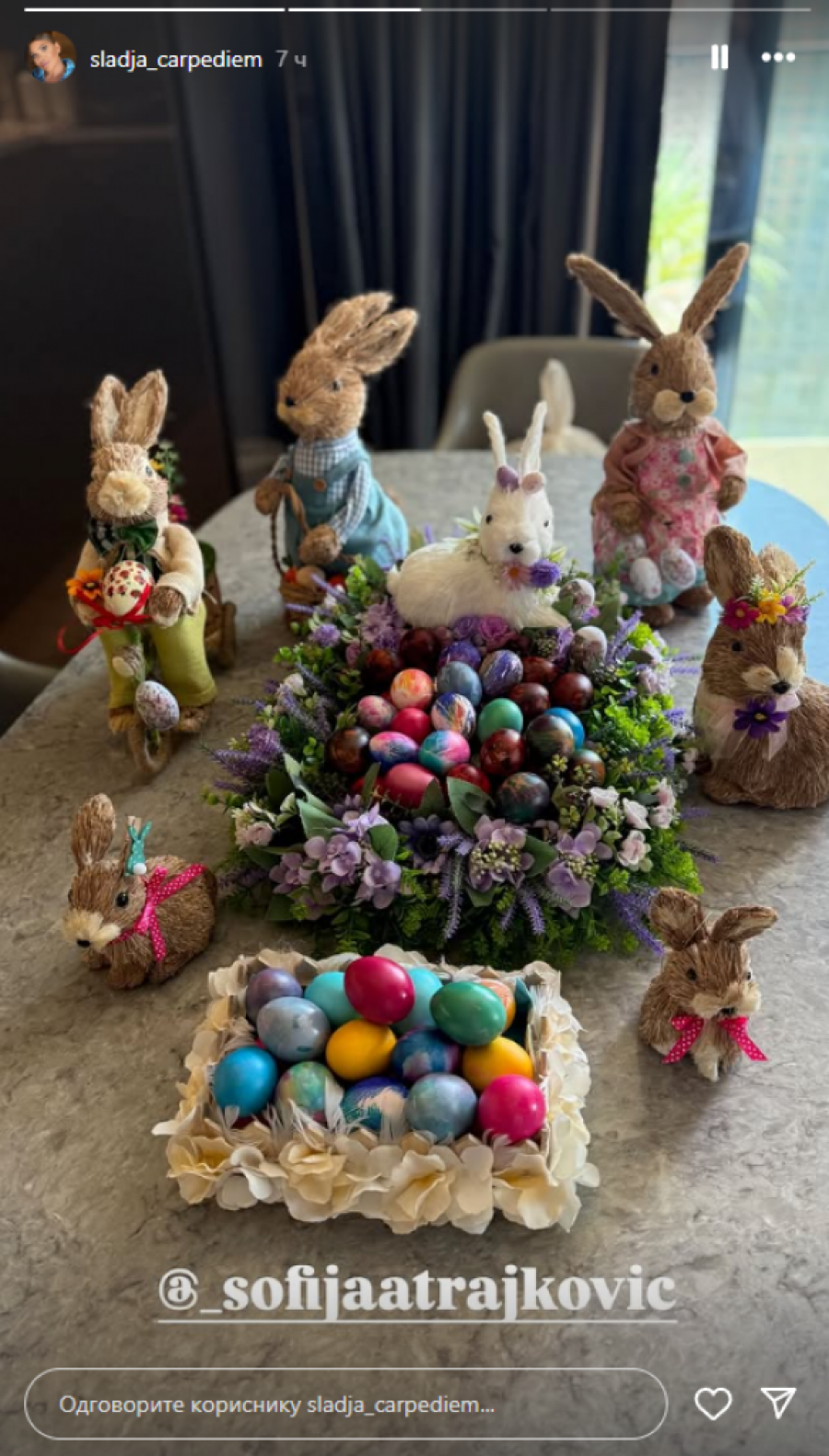 U ovom procesu, Slađana nije bila sama. Njena ćerka, Sofija Trajković je takođe bila uključena u farbanje jaja, čime su stvorile poseban trenutak zajedništva. Zajedničko kreativno izražavanje dodatno je obogatilo prazničnu atmosferu, a jaja su obarbana u više boja, što je unelo živahnost i radost u njihov dom. Uskršnje zeke, kao dekoracija, dodatno su upotpunile izgled trpeze, stvarajući pravi praznični ambijent.