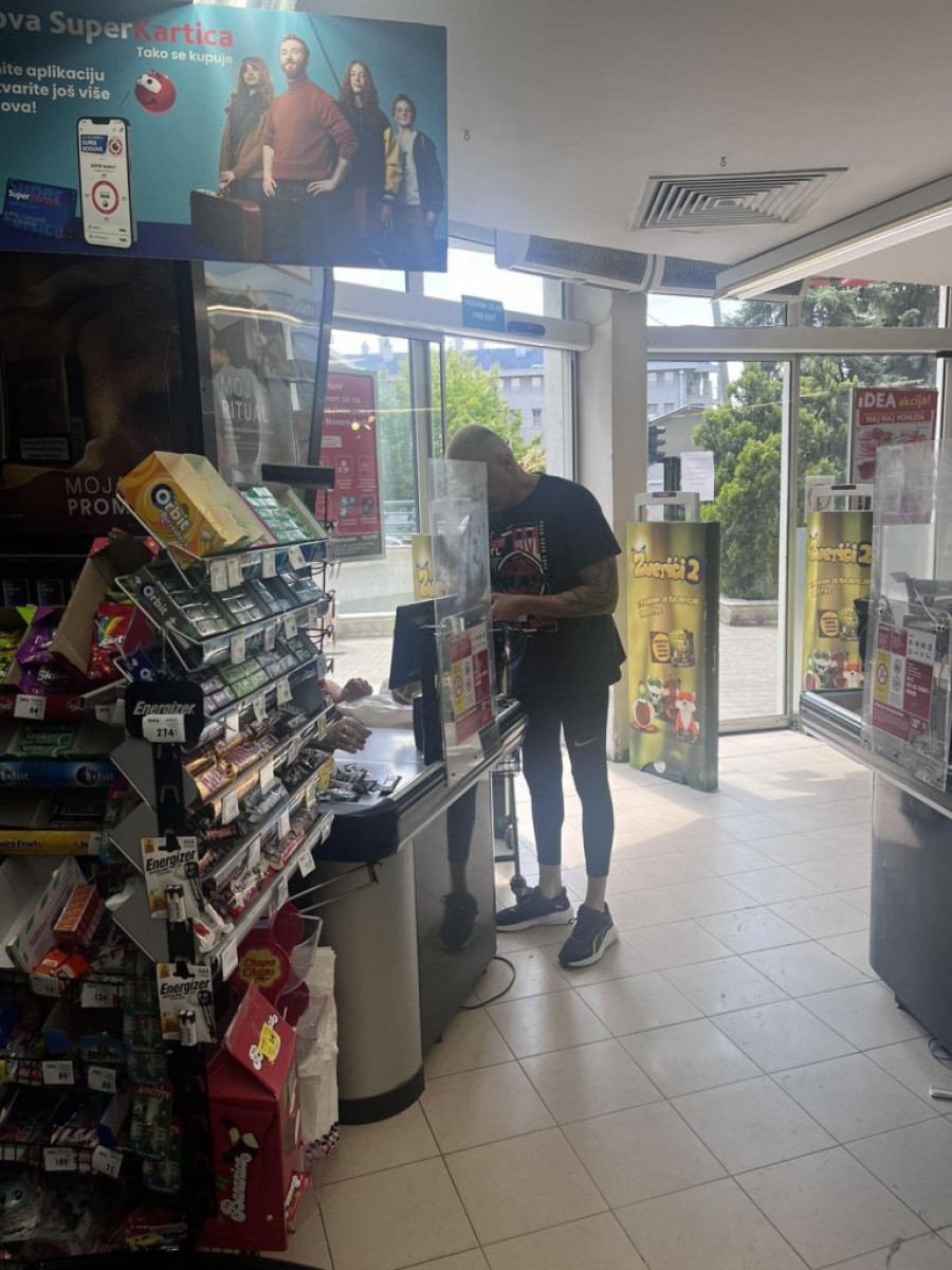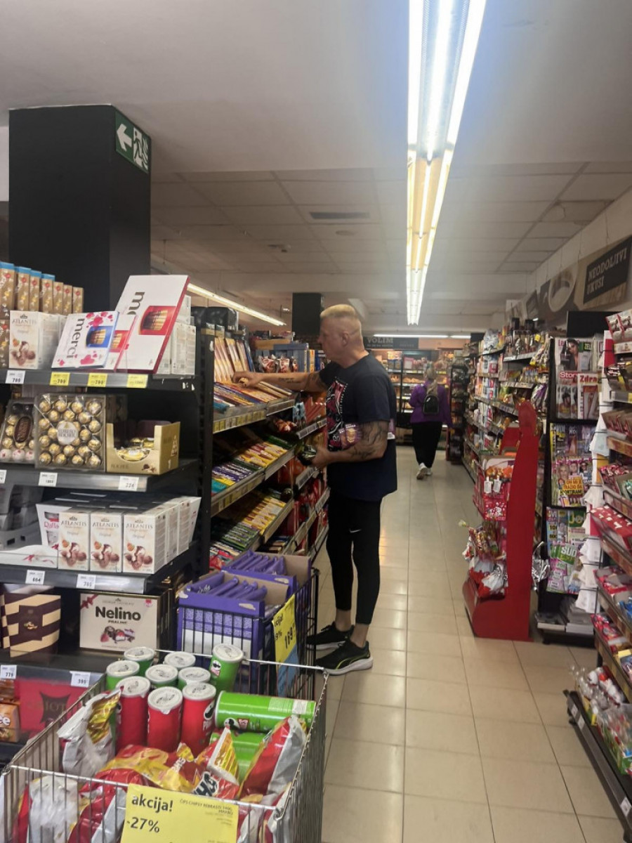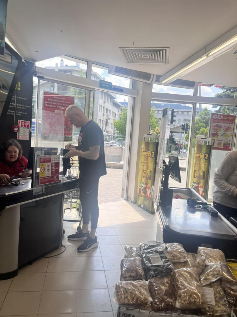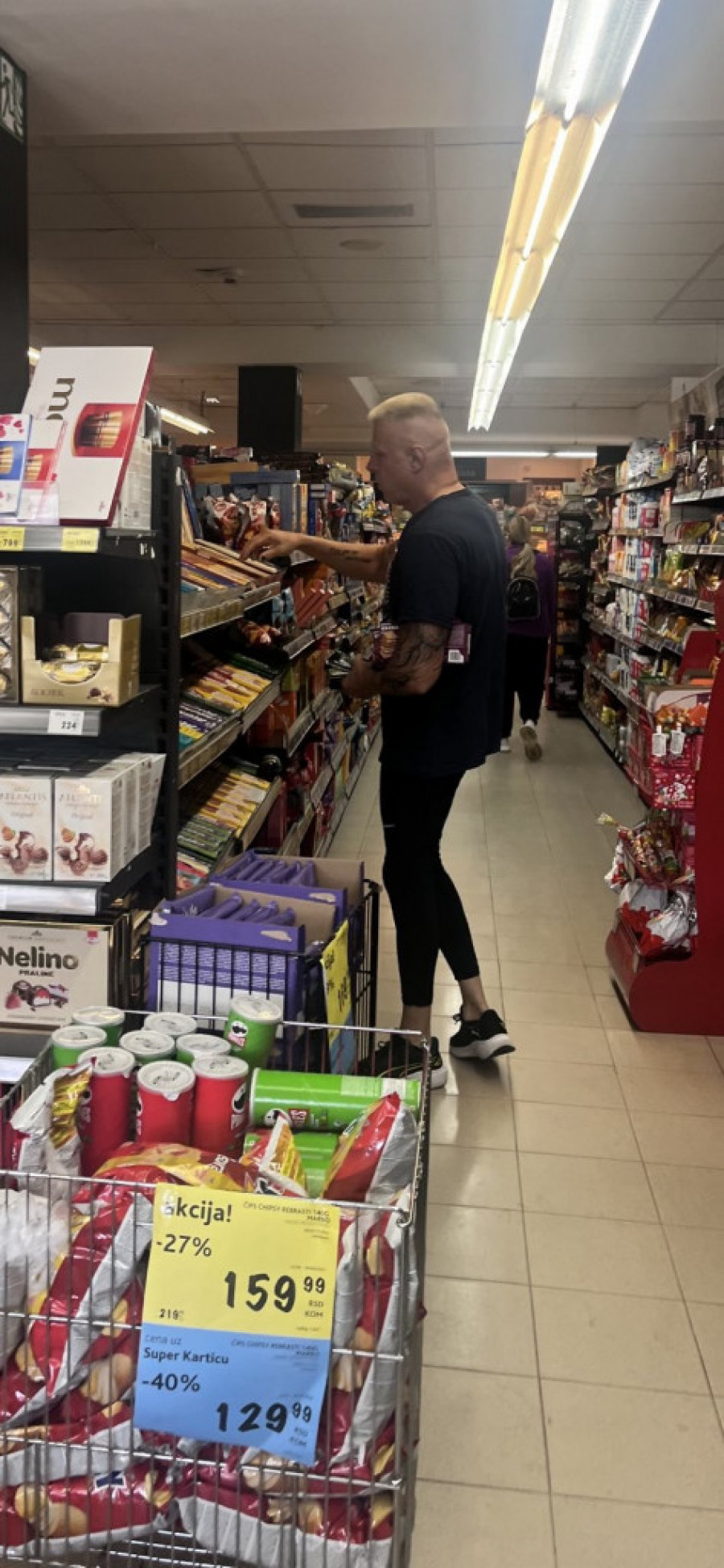 S obzirom na to da je bio u tamnoplavoj majici i crnim helankama, Đorđa je, bez obzira na izgled, odlučio da uđe u market. Ono što je zaista zapanjujuće jeste način na koji je obavio kupovinu. Bez korpe, otišao je direktno do rafa sa slatkišima, gde je uzeo dve kutije i stavio ih pod mišku. Zatim je dodao još i čokoladu od 300 grama, što pokazuje da je imao jasnu ideju šta želi, ali i da nije razmišljao o pravilima - ni o korišćenju korpe, ni o eventualnom plaćanju.