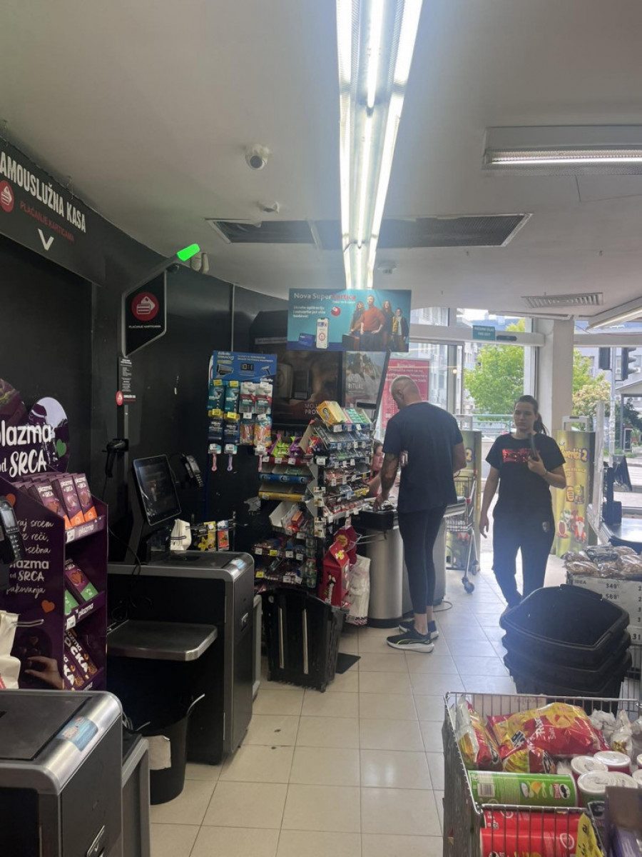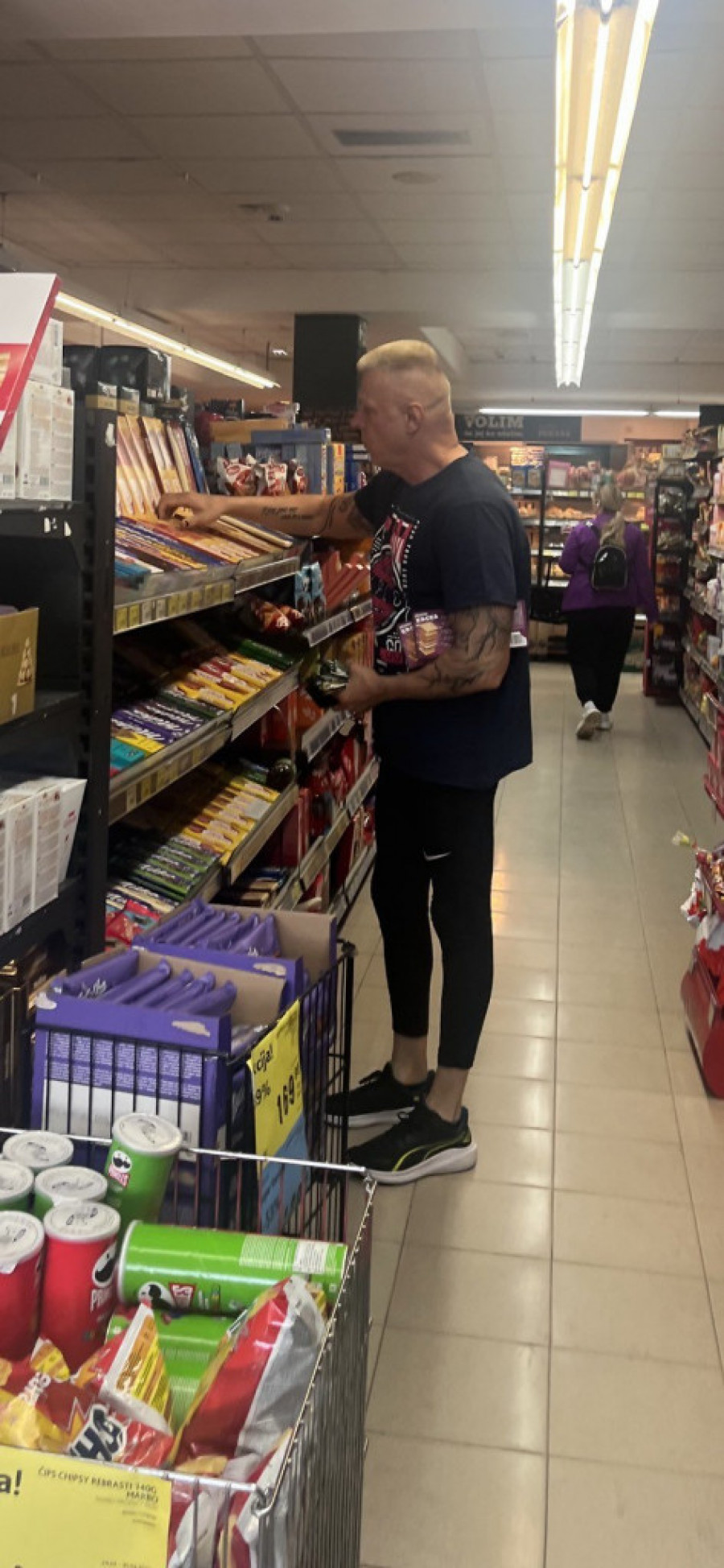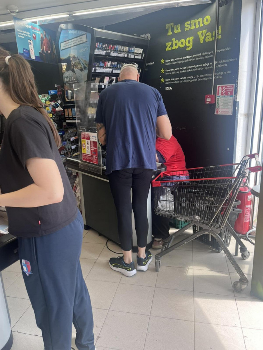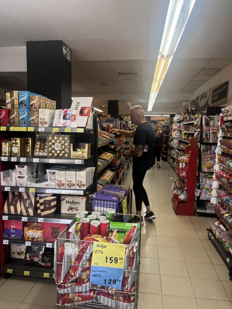 S obzirom na to da je bio u tamnoplavoj majici i crnim helankama, Đorđa je, bez obzira na izgled, odlučio da uđe u market. Ono što je zaista zapanjujuće jeste način na koji je obavio kupovinu. Bez korpe, otišao je direktno do rafa sa slatkišima, gde je uzeo dve kutije i stavio ih pod mišku. Zatim je dodao još i čokoladu od 300 grama, što pokazuje da je imao jasnu ideju šta želi, ali i da nije razmišljao o pravilima - ni o korišćenju korpe, ni o eventualnom plaćanju.
