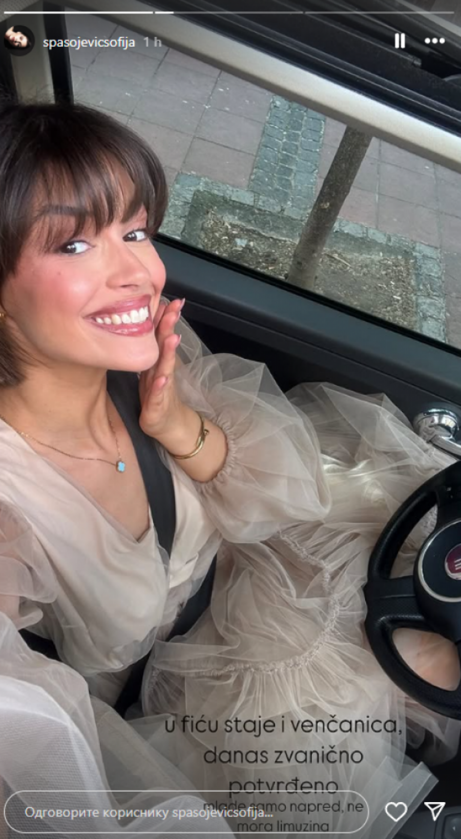 Jedna od najzanimljivijih objava koja je izazvala pravu pometnju među pratiocima bila je fotografija na kojoj Sofija nosi venčanicu dok sedi u automobilu – ne u bilo kom, već u čuvenom Fići. Uz ovu neobičnu sliku, voditeljka je šaljivo poručila: "U Fiću staje i venčanica, danas zvanično potvrđeno. Mlade samo napred, ne mora limuzina."Ova objava izazvala je lavinu komentara i spekulacija: da li se zaista radi o pravoj svadbi ili je to možda još jedan kreativni momenat u okviru snimanja reklamnog sadržaja s obzirom na to da je Sofija zaštitno lice mnogih brendova.