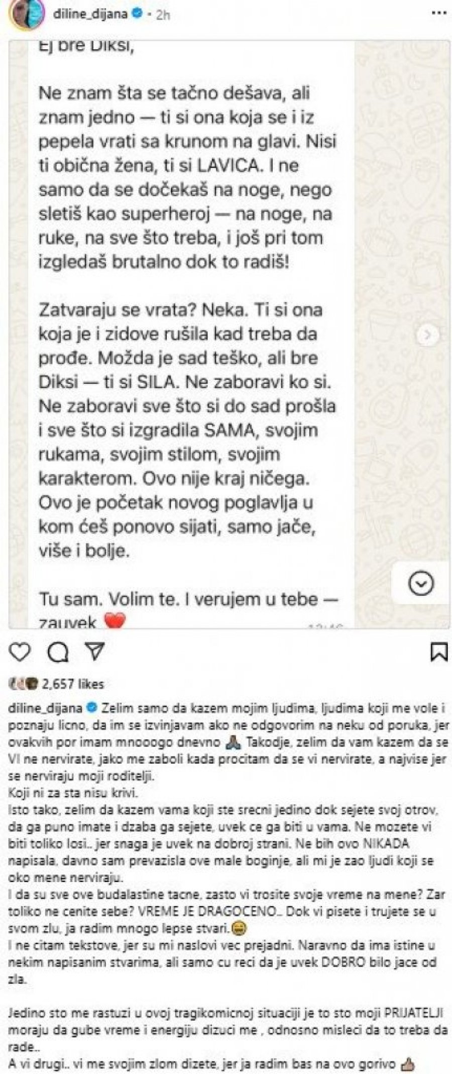 - Isto tako, želim da kažem vama koji ste srećni jedino dok sejete svoj otrov, da ga puno imate i džaba ga sejete, uvek će ga biti u vama. Ne možete vi biti toliko loši, jer snaga je uvek na dobroj strani. Ne bih ovo nikada napisala, davno sam prevazišla ove male boginje, ali mi je žao ljudi koji se oko mene nerviraju - izjavila je Dijana, pa dodala: