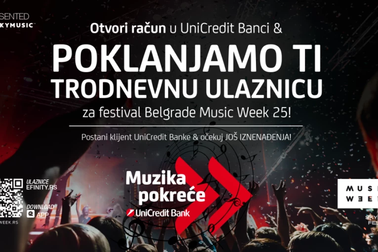 Svi koji otvore račun u UniCredit Banci dobijaju trodnevnu ulaznicu za Belgrade Music Week 25 - poklon koji vodi pravo na najveći regionalni festival popularne muzike!