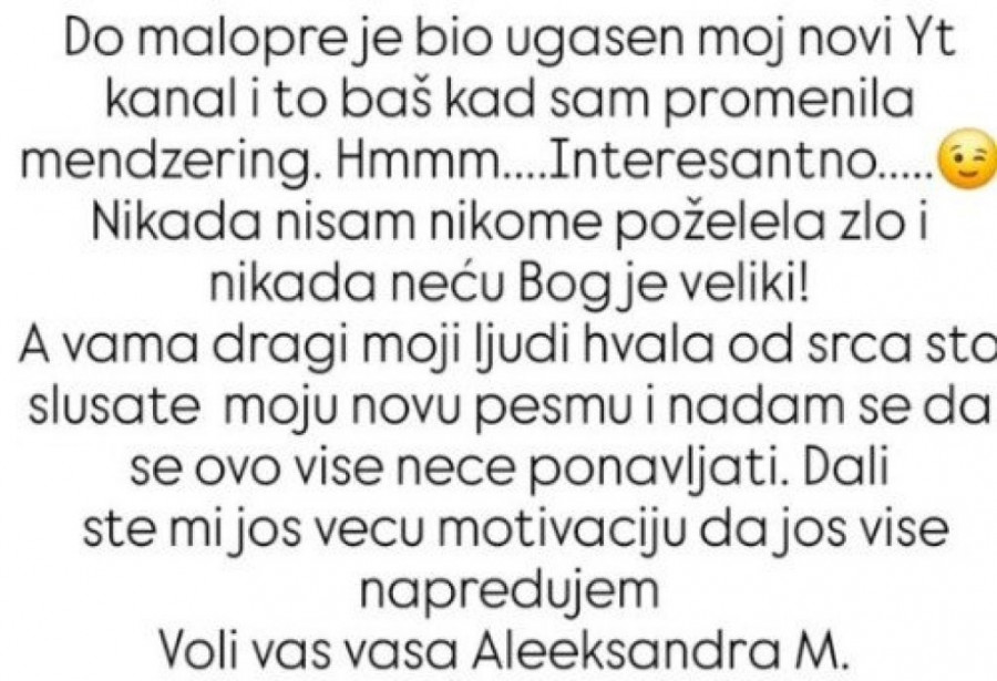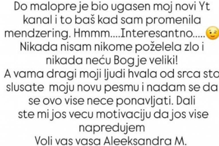- Do malopre je bio ugašen moj YT kanal, i to baš kad sam promenila menadžering! Hm... interesantno! Nikada nisam nikome poželela zlo i nikada neću! bog je veliki! A vama, dragi moji ljudi, hvala od srca što slušate moju novu pesmu i nadam se da se ovo više neće ponavljati. Dali ste mi još veću motivaciju da još više napredujem. Voli vas vaša Aleksandra M - dodala je pevačica.