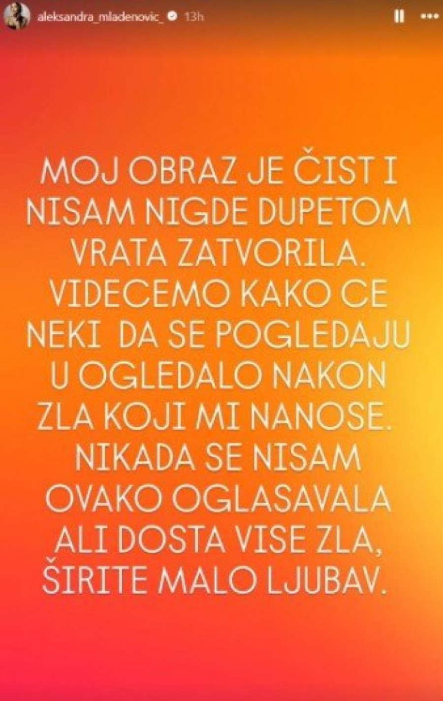 - Moj obraz je čist i nisam nigde du*etom zatvorila vrata. Videćemo kako će neki da se pogledaju u ogledalo nakon zla koji mi nanose. Nikada se nisam ovako oglašavala. Ali dosta je više zla, širite malo ljubavi - istakla je Mladenovićka.