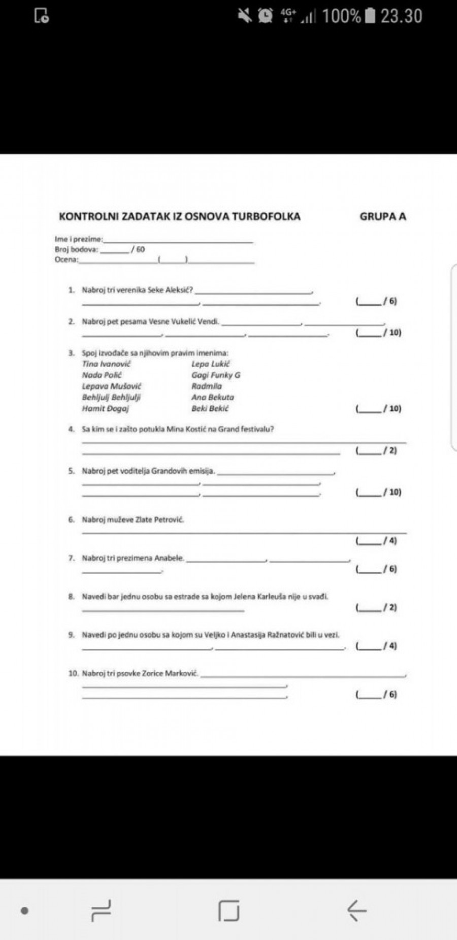Kako su u radne sveske iz srpskog jezika ušli stihovi koje peva Svetlana Ceca Ražnatović, a pre par godina i na testove opšte informisanosti naslovi pesama Jelene Karleuše, te malo po malo postaje prihvaćeno kao opšta kultura sve što šoubiz zvezde rade,tako se i na internetu našao šaljiv i zanimljiv "kontrolni zadatak" gde bi onaj ko ga rešava trebalo da zna sve o našim zvezdama koje se svakodnevno vrte po malim ekranima.